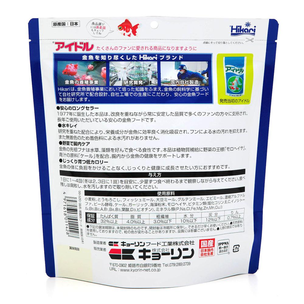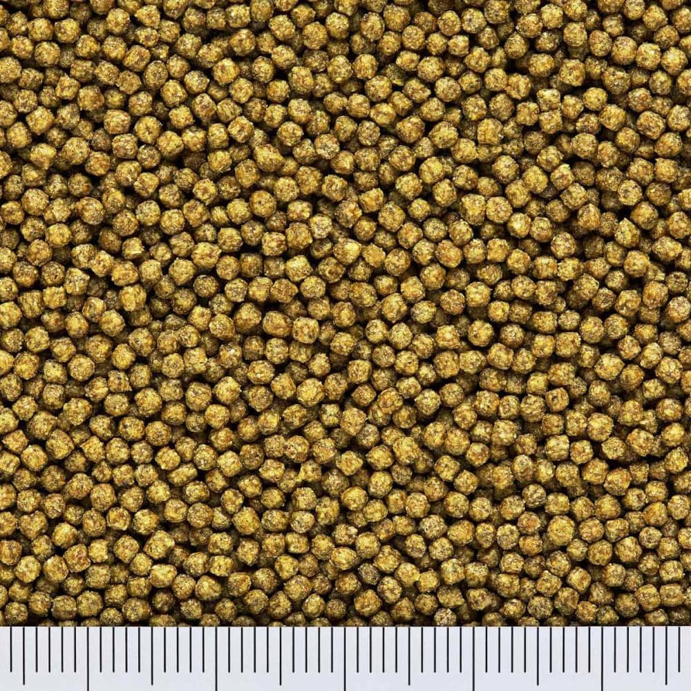 原材料・成分:小麦粉、とうもろこし、フィッシュミール、大豆ミール、グルテンミール、エビミール、濃縮アルファルファ、ビール酵母、ケール、ガーリック、海藻粉末、モロヘイヤ、ビタミン類(塩化コリン,E,C,イノシトール,B5,B2,A,B1,B6,B3,葉酸,D3,ビオチン)、ミネラル類(P,Na,Cl,Fe,Mg,Zn,Mn,Cu,I)