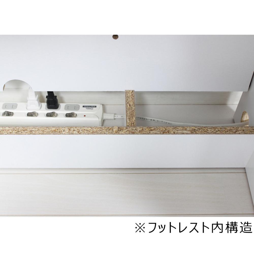 フットレストのフタは両脇がプッシュ回転ピンでとまってて上にオープンできる仕様です。フタを開けるとタップ収納となっています。タップ収納の両脇の側板には配線通しの穴(約直径3cm)があいています。