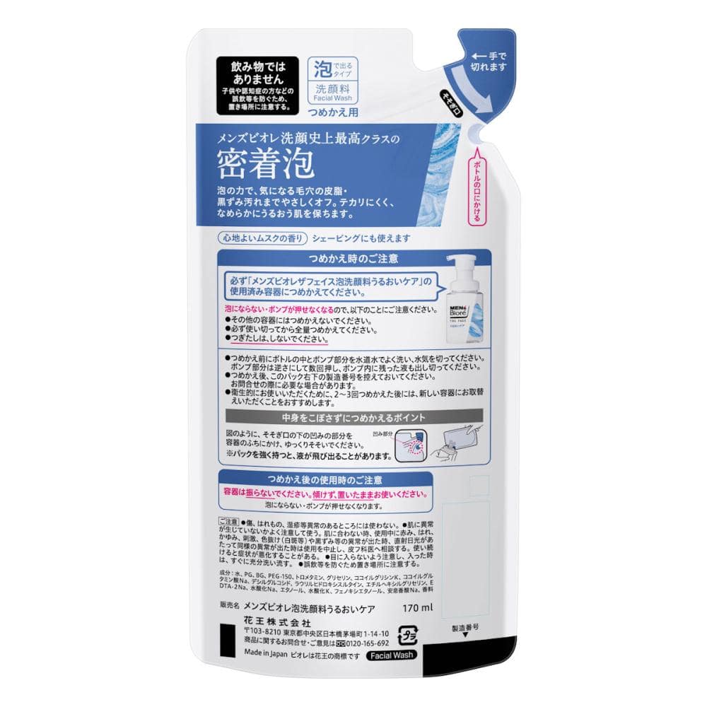 使用上の注意:必ず「メンズビオレザフェイス泡洗顔料うるおいケア」の使用済み容器につめかえてください。 泡にならない・ポンプが押せなくなるので、以下のことにご注意ください。 ●その他の容器にはつめかえないでください。 ●必ず使い切ってから全量つめかえてください。 ●つぎたしは、しないでください。 ●つめかえ前にボトルの中とポンプ部分を水道水でよく洗い、水気を切ってください。ポンプ部分は逆さにして数回押し、ポンプ内に残った液も出し切ってください。 ●つめかえ後、このパック右下の製造番号を控えておいてください。お問合せの際に必要な場合があります。 ●衛生的にお使いいただくために、2~3回つめかえた後には、新しい容器にお取替えいただくことをおすすめします。 つめかえ後の使用時のご注意 容器は振らないでください。傾けず、置いたままお使いください。 泡にならない・ポンプが押せなくなります。 ご注意 ●傷、はれもの、湿疹等異常のあるところには使わない。 ●肌に異常が生じていないかよく注意して使う。