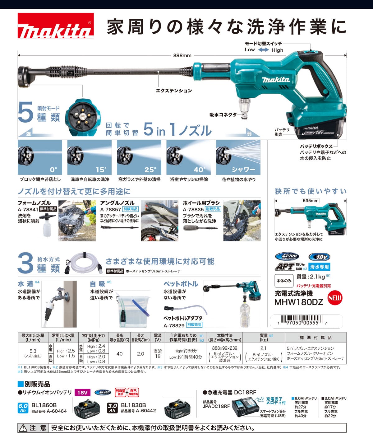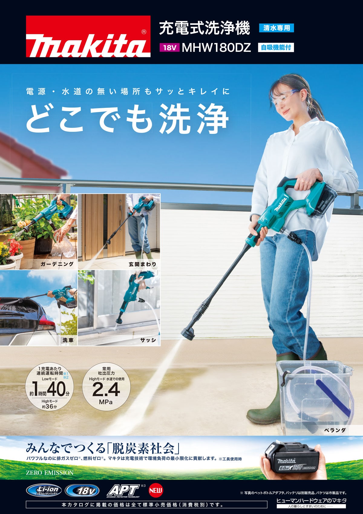 ●家周りの様々な洗浄作業に ●最大吐出圧力2.4MPaを誇り、ベランダ、ガーデニング、洗車、玄関まわりの清掃など、家周りの様々な洗浄作業に最適です。 ●1充電あたりの連続運転時間は、Lowモードで約1時間40分、Highモードで約36分となっており、効率的に作業を進めることができます。 ●ブラシで汚れを落としながら洗浄できるため、頑固な汚れも簡単に除去できます。 ●清水専用で、バッテリーボックスは水の侵入を防ぐ設計になっています。 ●エクステンションを取り外せば狭い場所での使用も可能です。 ●18Vバッテリ