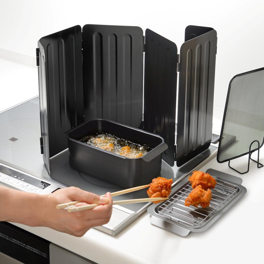 ・フッ素樹脂加工でお手入れしやすく折り畳んでスッキリ収納できます。 ・手前までしっかり覆えるサイドパネル2面、鍋の大きさや形状に合わせてフィット 油はねから壁面をガード。 ・蛇腹に折りたたんだパネルを広げるだけで簡単に設置できます。