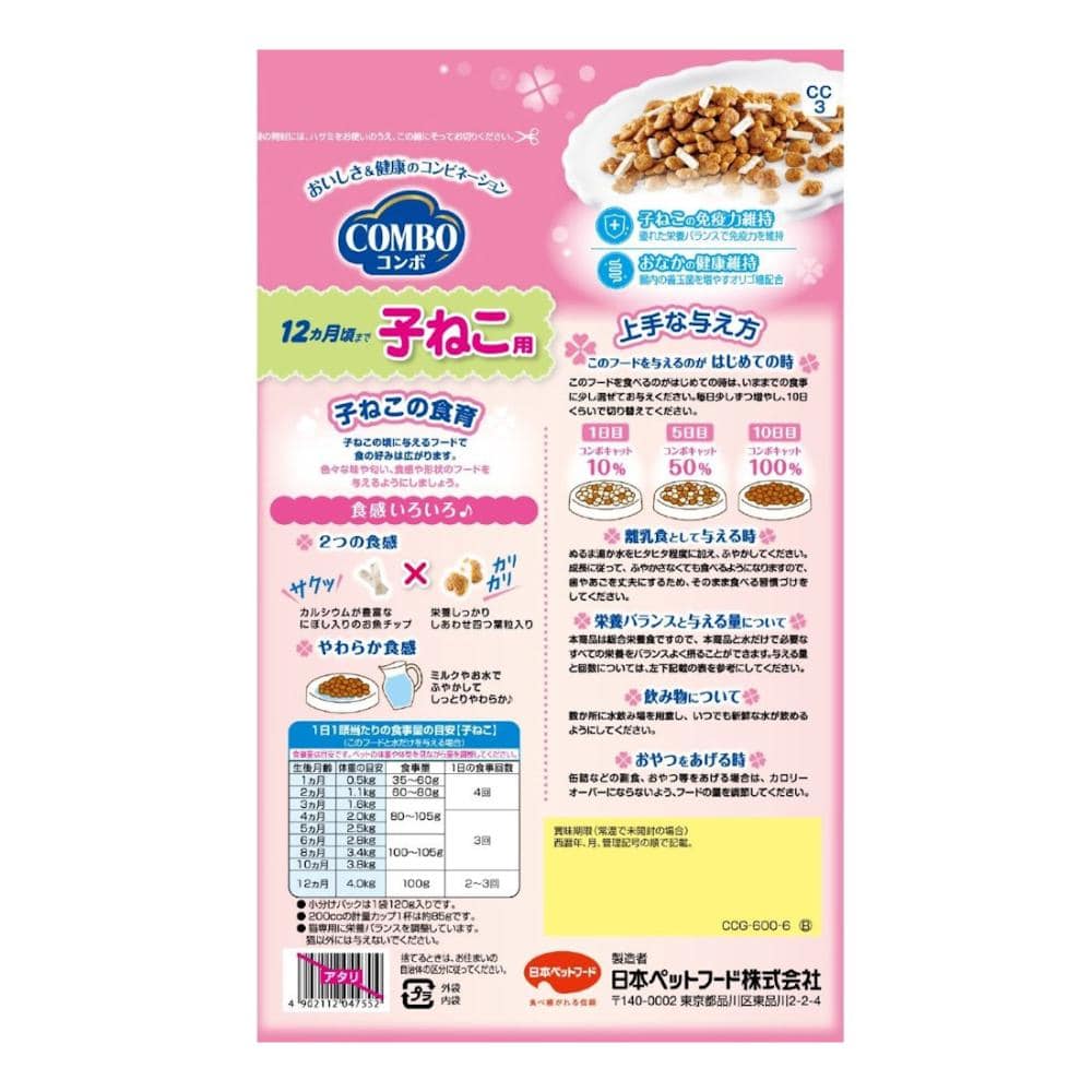 【使用時の注意事項】 ●このフードを与えるのがはじめての時:このフードを食べるのがはじめての時は、いままでの食事に少し混ぜてお与えください。 毎日少しずつ増やし、10日くらいで切り替えてください。 1日目 コンボキャット10% 5日目 コンボキャット50% 10日目 コンボキャット100% ●離乳食として与える時:ぬるま湯か水をヒタヒタ程度に加え、ふやかしてください。 成長に従って、ふやかさなくても食べるようになりますので、歯やあごを丈夫にするため、 そのまま食べる習慣づけをしてください。 ●栄養バランスと与える量について:本商品は総合栄養食ですので、本商品と水だけで必要なすべての栄養をバランスよく摂ることができます。 ●飲み物について:数か所に水飲み場を用意し、いつでも新鮮な水が飲めるようにしてください。 ●おやつをあげる時:缶詰などの副食、おやつ等をあげる場合は、カロリーオーバーにならないよう、フードの量を調節してください。