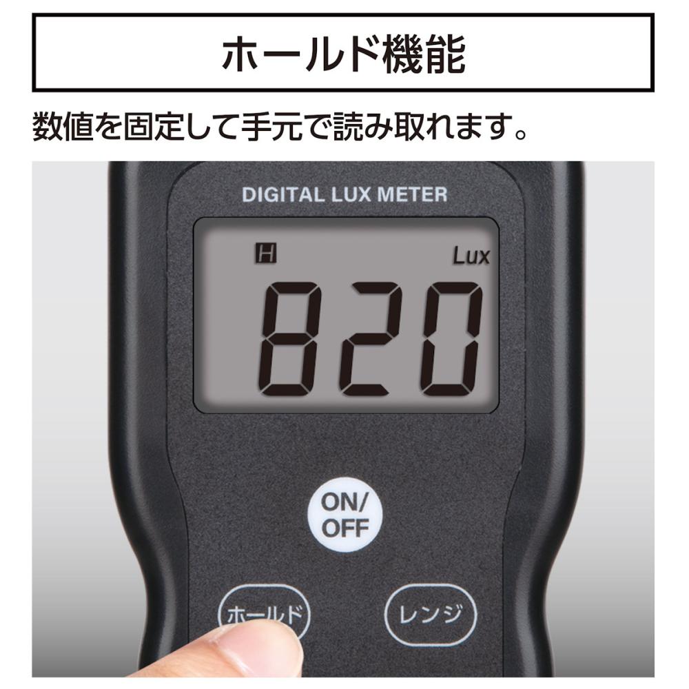 "●事務所、作業環境などの照度管理に。 ●LED照明の測定ができます。 ●照度に合わせて、測定範囲を4段階に切り替えることができます。 ●読み取りやすい大型液晶(文字高16mm)を採用しました。 ●測定値の固定ができるホールド機能付です。 ●受光部が270°回転できるので、受光しやすい角度に調整できます。"
