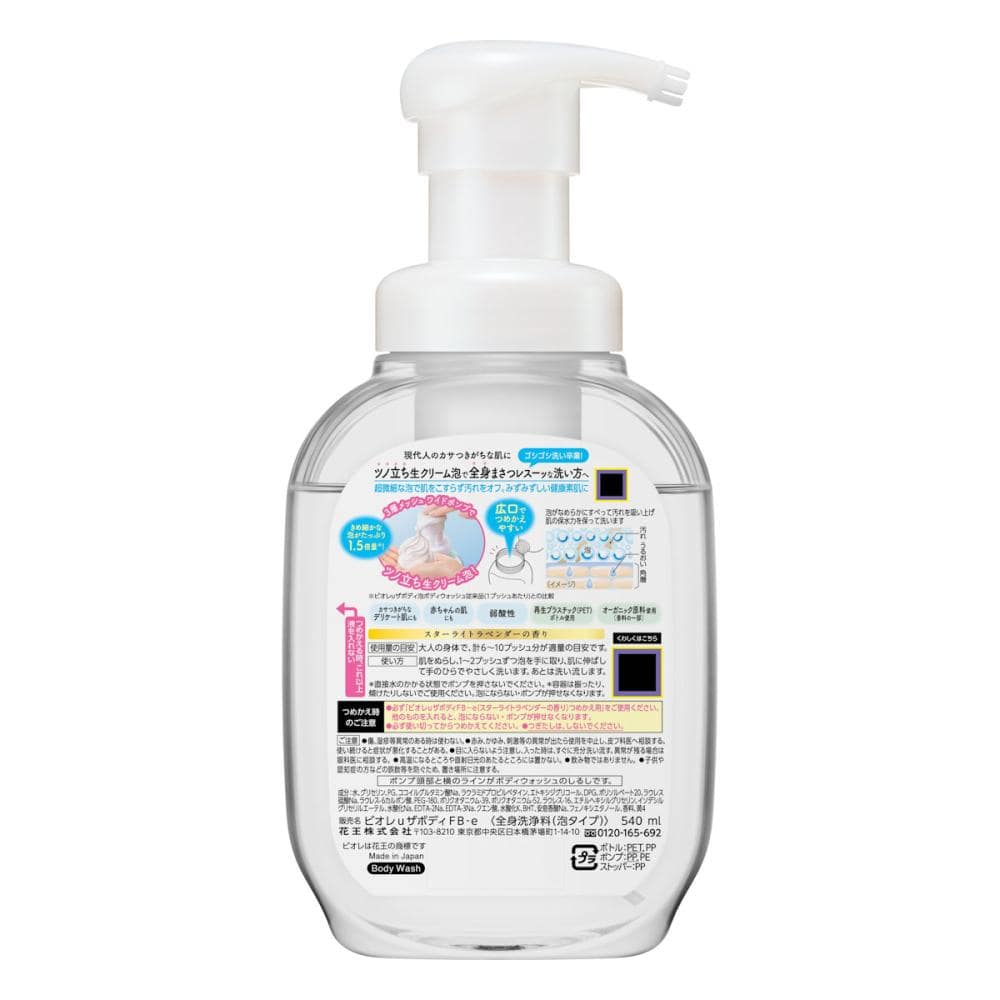 使用上の注意:つめかえ時のご注意 ●必ず「ビオレuザボディFB-e(スターライトラベンダーの香り)つめかえ用」をご使用ください。他のものを入れると、泡にならない・ポンプが押せなくなります。 ●必ず使い切ってからつめかえてください。 ●つぎたしは、しないでください。 ご注意 ●傷、湿疹等異常のある時は使わない。 ●赤み、かゆみ、刺激等の異常が出たら使用を中止し、皮フ科医へ相談する。使い続けると症状が悪化することがある。 ●目に入らないよう注意し、入った時は、すぐに充分洗い流す。異常が残る場合は眼科医に相談する。 ●高温になるところや直射日光のあたるところには置かない。 ●飲み物ではありません。 ●子供や認知症の方などの誤飲等を防ぐため、置き場所に注意する。