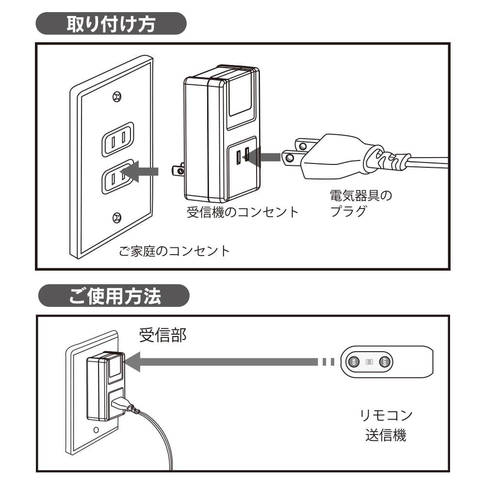 ●コンセントに受信機を差し込み、使用する電気器具のプラグを受信機に差し込むだけですぐ使えます
