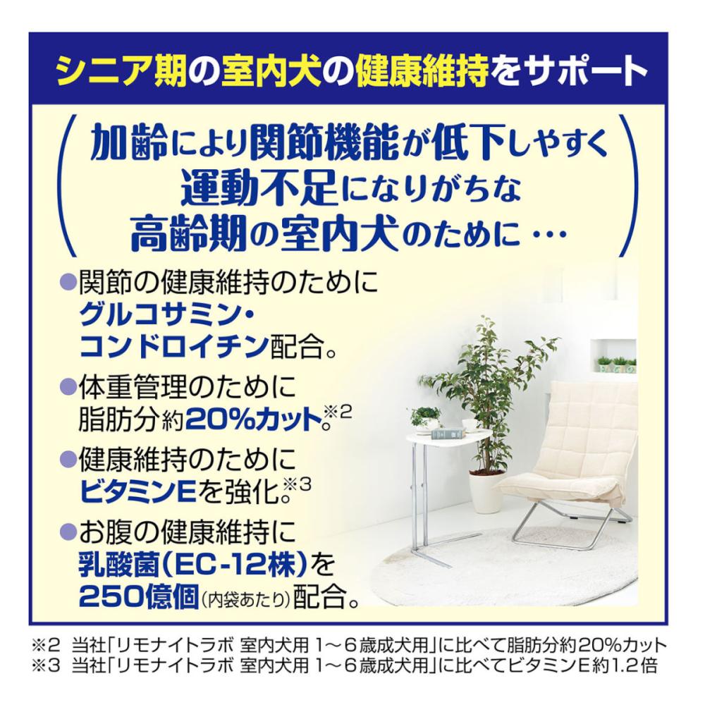 阿蘇の天然のミネラル〈リモナイト〉で気になる便臭・尿臭を約80%カット(2週間給与後の硫化水素・メチルメルカプタン・アンモニアの消臭率(当社調べ))!関節の健康や、運動不足が気になる高齢期の室内犬のために、グルコサミン・コンドロイチンを配合し、脂肪分約20%カット(当社「リモナイトラボ 室内犬用1~6歳成犬用」に比べて)しました。乳酸菌(EC-12株)250億個(内袋当り)&オリゴ糖配合でさらにカラダすっきり!健康維持のためにビタミンEを強化(当社「リモナイトラボ 室内犬用1~6歳成犬用」に比べて)!小さな愛犬にも食べやすい、やわらか&超小粒タイプ。生肉を使用し、豊かな味わいが楽しめるチキン味。