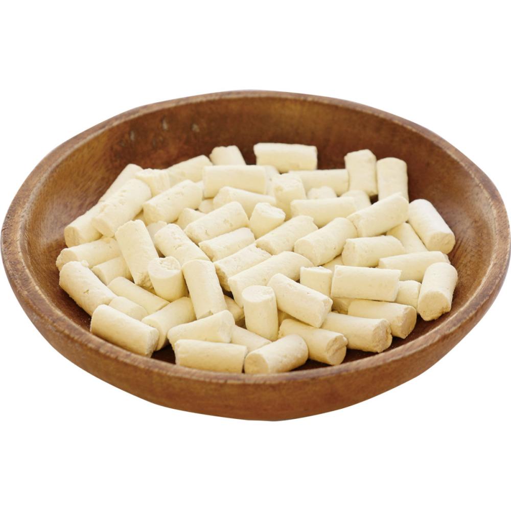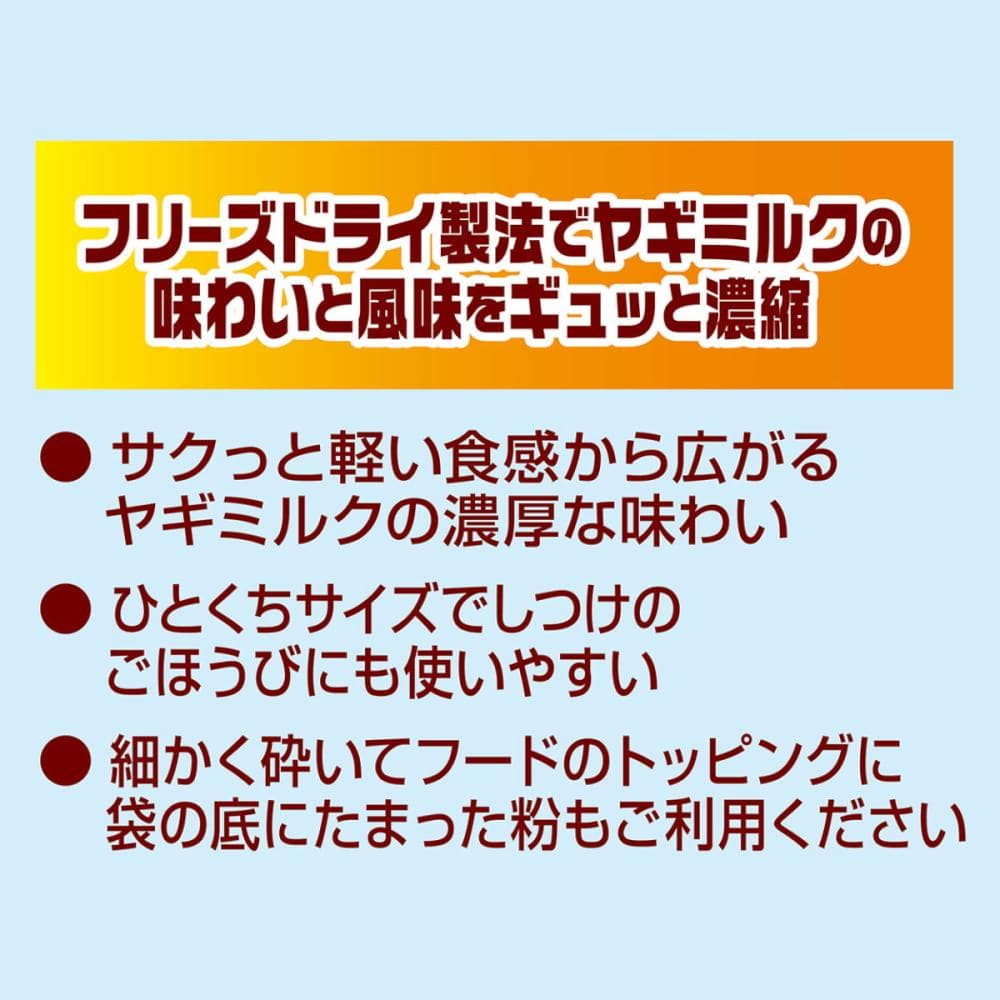 サクっと軽い食感から広がるヤギミルクの濃厚な味わい。 ひとくちサイズでごほうびにも使いやすい。細かく砕いてフードのトッピングに。 着色料・保存料・香料 無添加。 農林水産省認定 鳥加熱処理工場製造。