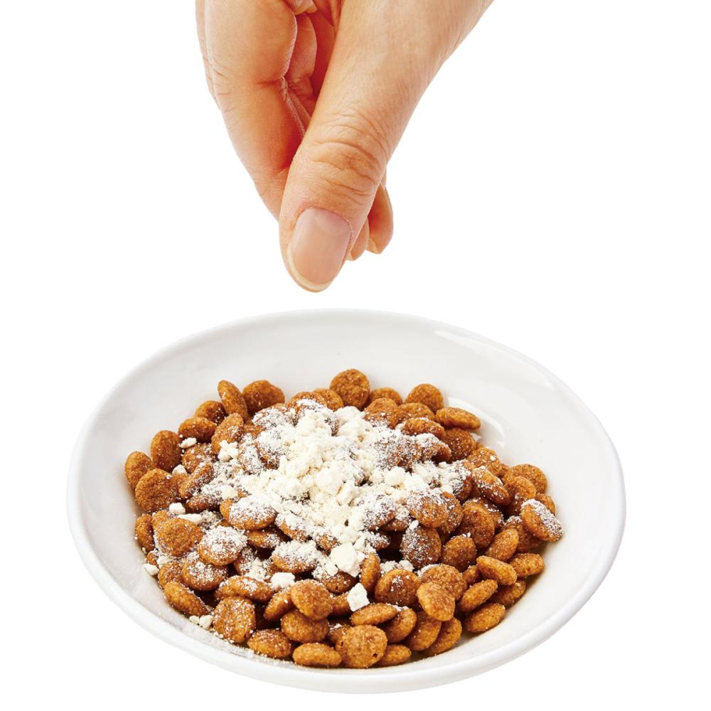 栄養成分表示:たん白質:41.5%以上、脂質:5.0%以上、粗繊維:0.5%以下、灰分:5.0%以下、水分:7.0%以下
