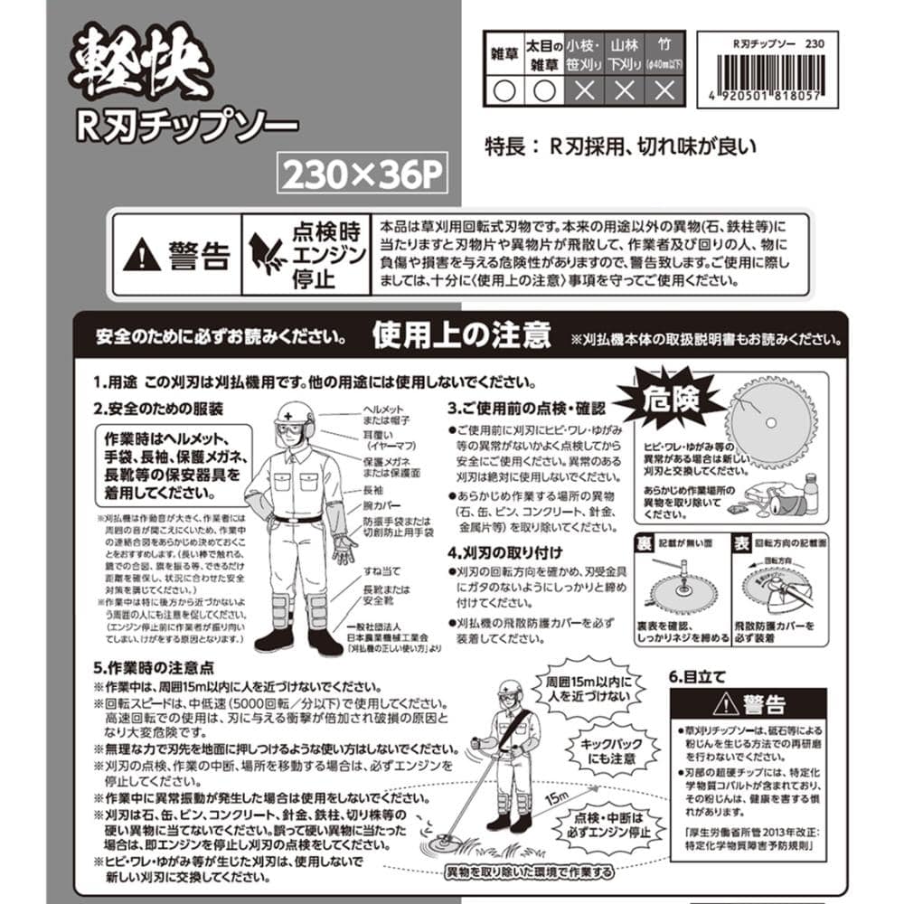 本品は草刈用回転式刃物です。本来の中途以外の異物(石、鉄柱等)に当たりますと刃物片や異物片が飛散、作業者及び回りの人、物に負傷や損害を与える危険性がありますので、警告致します。ご使用に際しましては、十分に(使用上の注意事項)を守ってご使用ください。