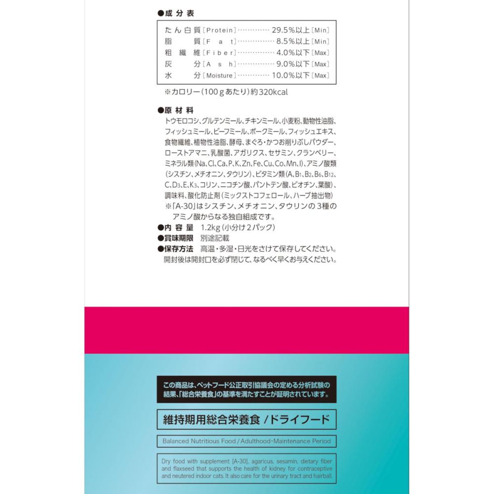 室内で過ごす避妊・去勢後の成猫の健康に配慮し低脂肪に調整。 下部尿路の健康維持のためマグネシウム、リン、カルシウムを調整し、食物繊維の配合により体内の毛玉を無理なく排泄します。 食物アレルギーに配慮してアレルゲンになりにくいといわれるフィッシュを使用し、健康を維持する事で免疫をサポートするアガリクスや抗酸化成分があるセサミンを配合しています。 腎臓の健康維持に配慮し、ナトリウムの含有量を調整。