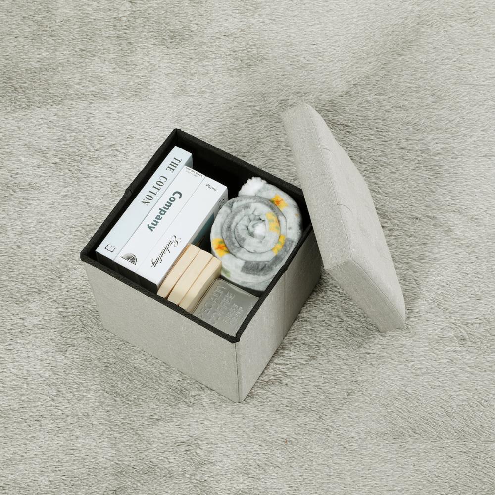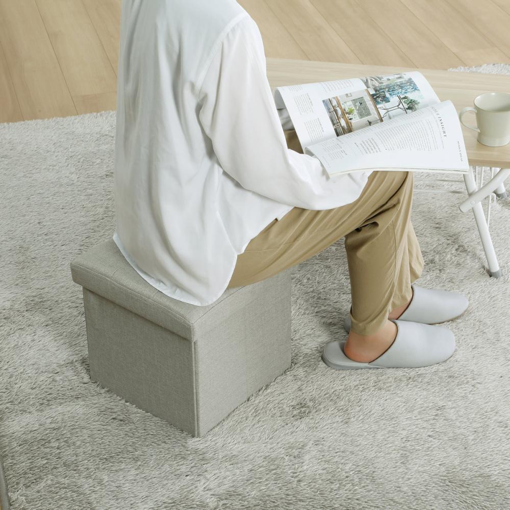 ■座面がフタになっていて、スツール内に小物を収納することができます。本やお子様のおもちゃ、いざというときの防災グッズなどを気軽に収納。