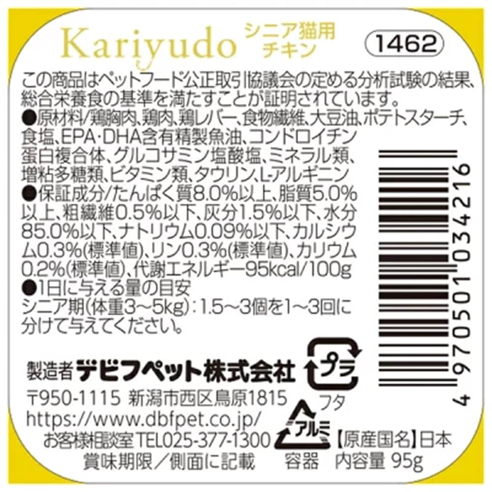 原材料・成分:鶏胸肉、鶏肉、鶏レバー、食物繊維、大豆油、ポテトスターチ、食塩、EPA・DHA含有精製魚油、コンドロイチン蛋白複合体、グルコサミン塩酸塩、ミネラル類、増粘多糖類、ビタミン類、タウリン、L-アルギニン