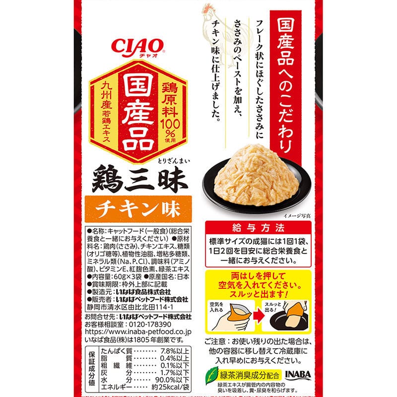 原材料・成分:鶏肉(とりささみ)、チキンエキス、糖類(オリゴ糖等)、植物性油脂、増粘多糖類、ミネラル類(Na、P、Cl)、調味料(アミノ酸)、ビタミンE、紅麹色素、緑茶エキス