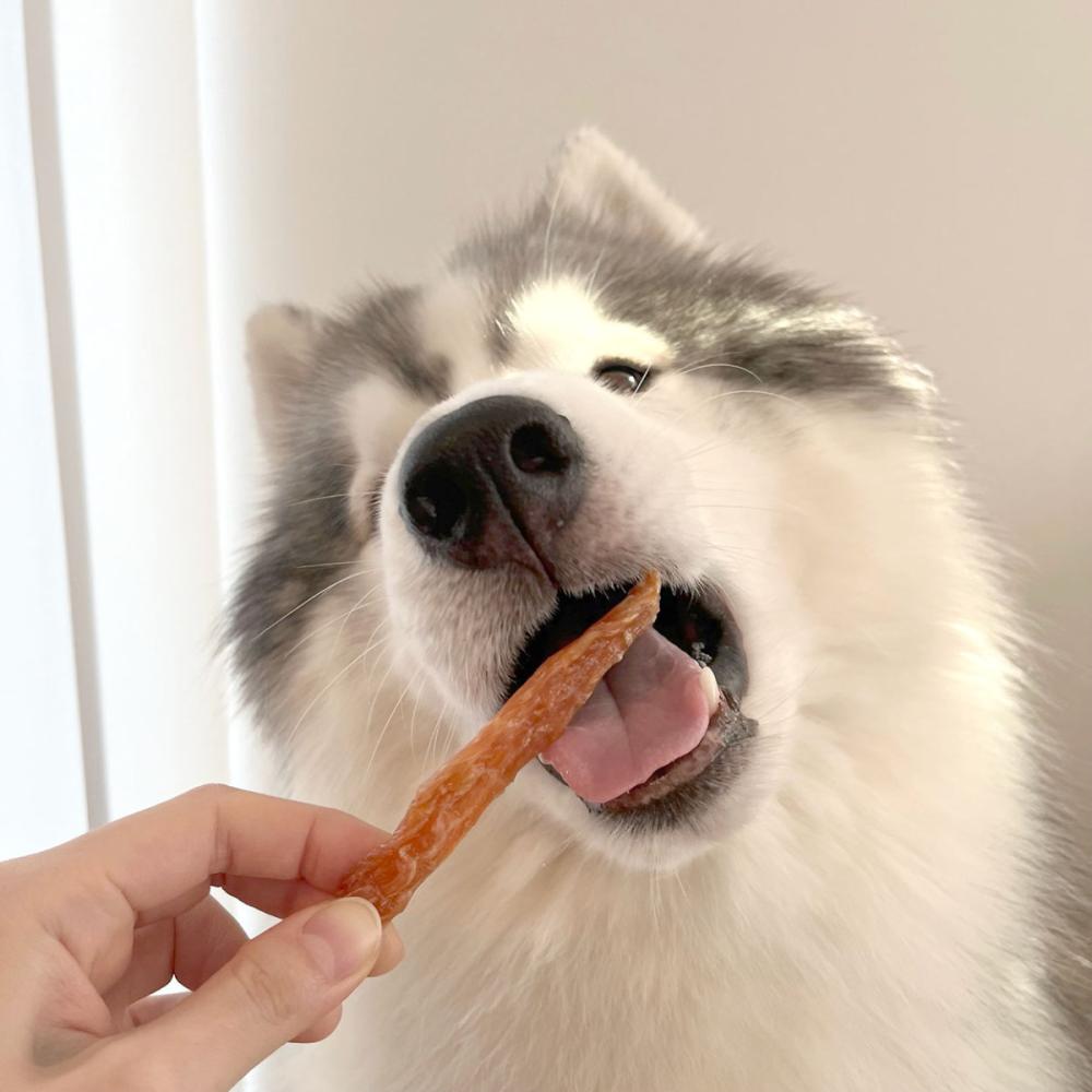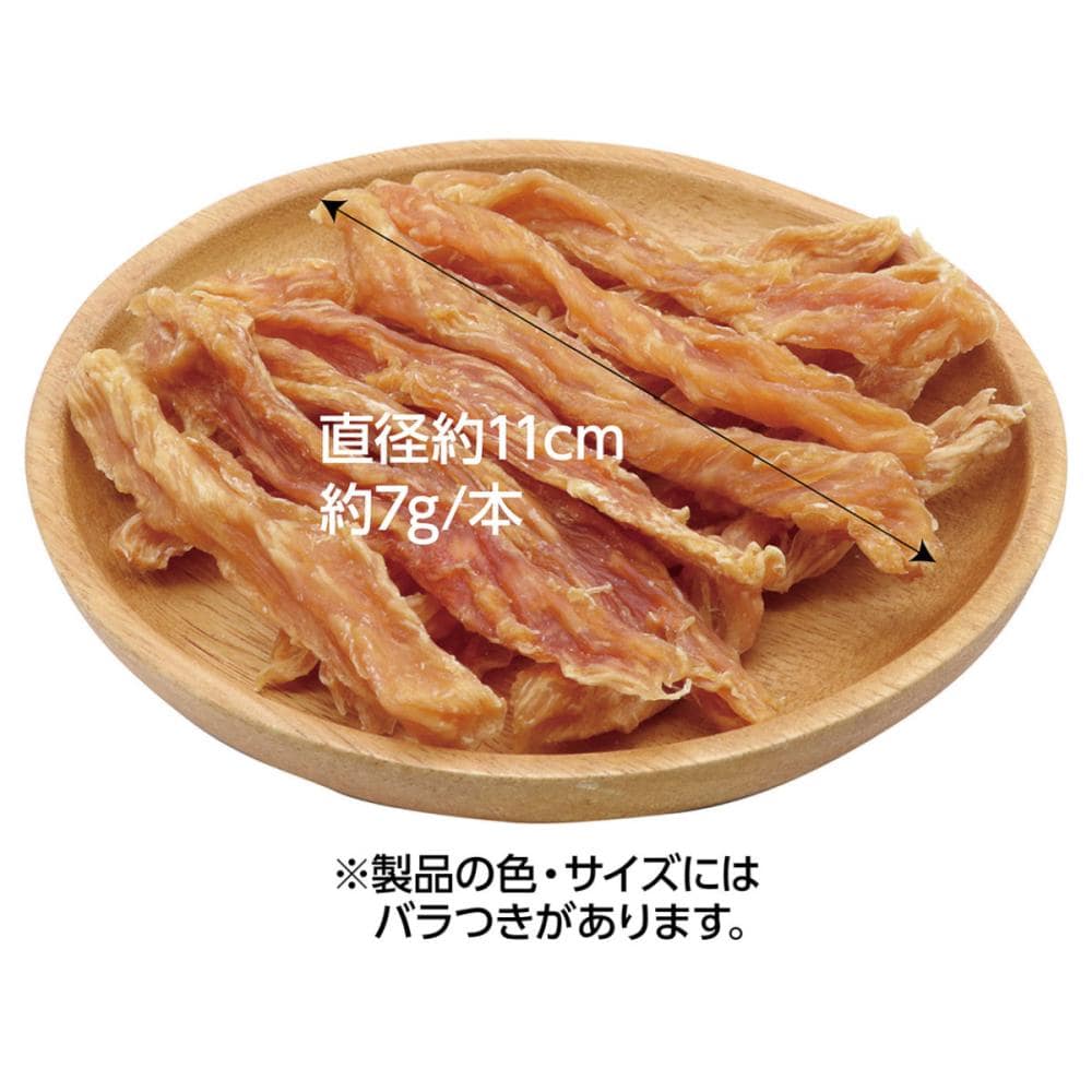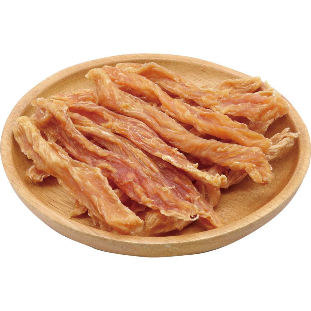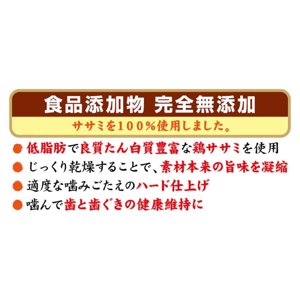 低脂肪で良質たん白質豊富な鶏ササミを100%使用。 じっくり乾燥することで素材本来の旨味を凝縮しました。 噛むほどに旨味広がる適度な噛みごたえが楽しめる。 噛んで歯と歯ぐきの健康維持に。食品添加物完全無添加。農林水産省認定 鳥加熱処理工場製造。