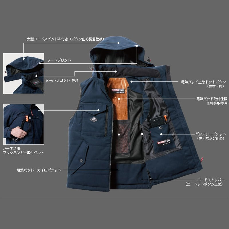 ●バートルのスポーティなデザインがかっこいいヒーターフーディジャケット。 ●サーモクラフト対応のアイテムなので電熱パッドを装着して更に暖かい。 ●程よいストレッチ感で防水、防風、撥水機能や保温力も兼ね備えています。 【素材】 表地:マイクロリップライトシェル(ポリエステル100%)、 別布:ニットストレッチボンディング(ポリエステル100%)、 裏地:ポリエステル100% 表地:耐久撥水加工、耐水圧10,000mm、透湿性5,000g/m2/24h(TPUラミネートコーティング)、 別布:3層レイヤー防風ラミネート加工、撥水加工