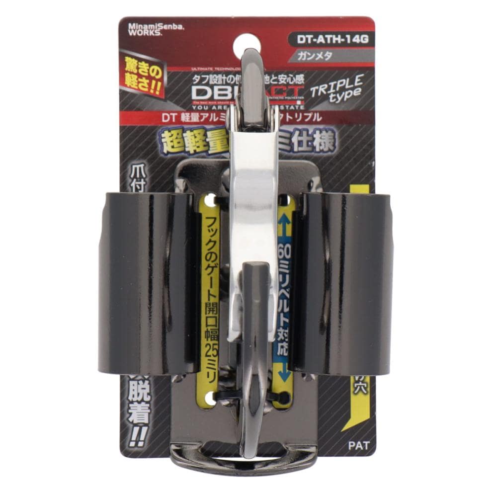 ●湾曲ゲート×爪付きで工具をスムーズ脱着。 ●モンキー・レンチ・ハンマーなどの吊り下げに。 ●驚きの軽さ! ●カラー:ガンメタ 【特長】 ●爪付き湾曲ゲートでスムーズ脱着! ●フックのゲート開口幅22mm ●60mmベルト対応 ●軽量&高強度! ●落下防止コード取り付け穴を上下に設置 ●強化リブを入れることにより30%破断強度UP! ●6箇所溶接により破損防止(カラビナ部) ●カラビナが直接掛けられるホルダー付き 【材質】 ●本体:アルミ ●ゲート部分:ステンレス
