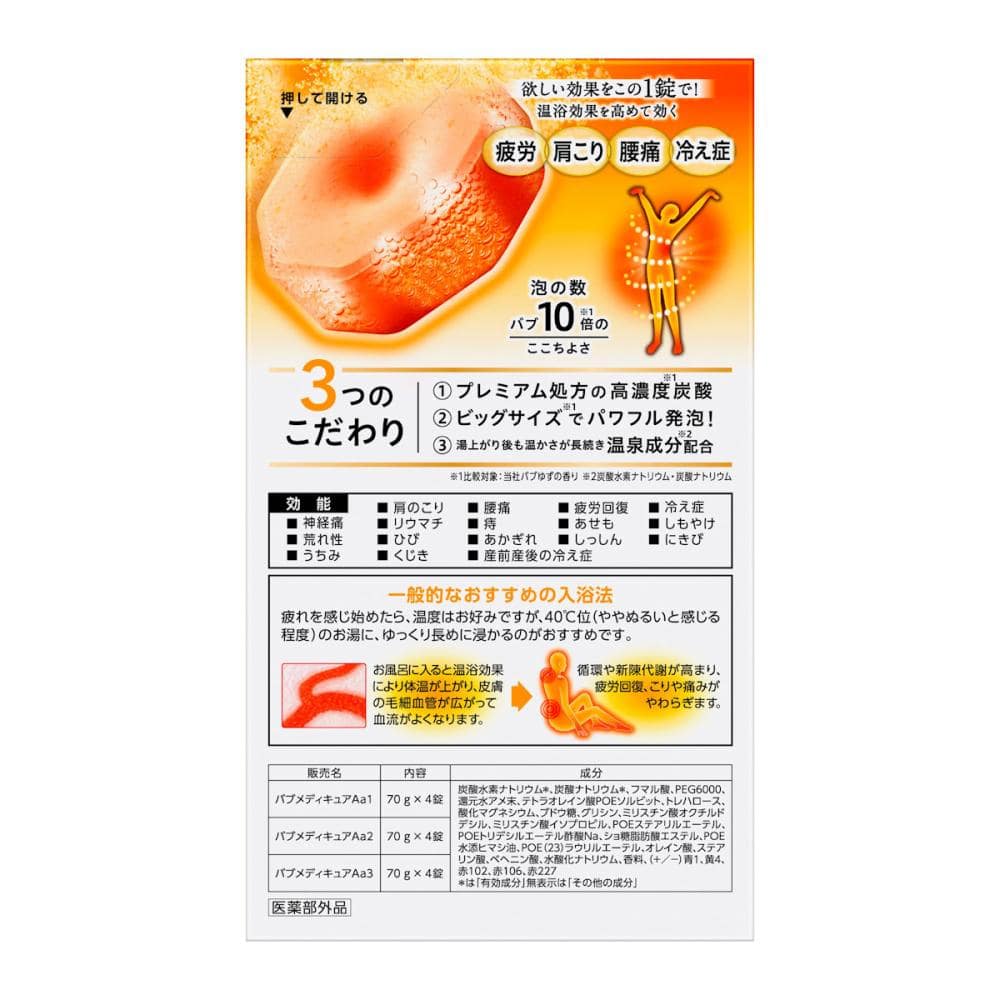 忙しい現代人の特に疲れがたまった時に選べる3香調。 いつものオフロが高濃度※1炭酸のオフロに変わる!欲しい効果をこの1錠で。 温浴効果を高めて、疲労・肩こり・腰痛・冷え症に効く。 ●泡の数バブ10倍※1のここちよさ ●ビッグサイズ※1でパワフル発泡 ●温泉成分※2配合 ●柑橘の香り ●森林の香り ●花果実の香り ※1比較対象:当社バブゆずの香り ※2炭酸水素ナトリウム・炭酸ナトリウム【医薬部外品】