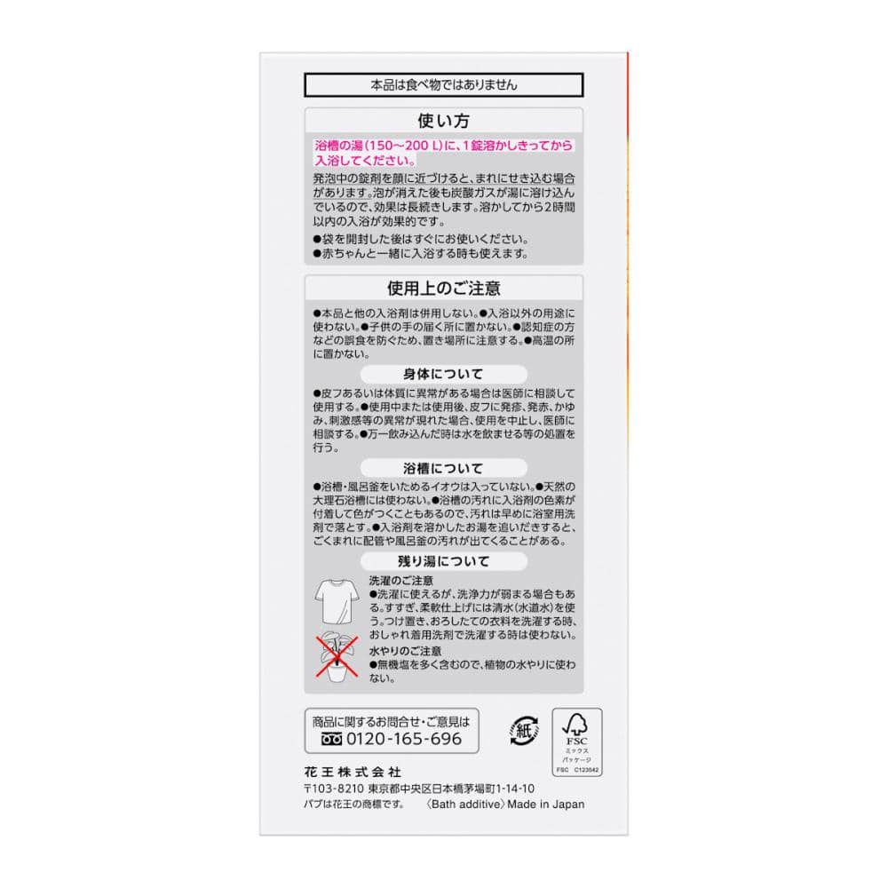 商品の利用(調理)方法:浴槽の湯(150~200L)に、1錠溶かしきってから入浴してください。 発泡中の錠剤を顔に近づけると、まれにせき込む場合があります。 泡が消えた後も炭酸ガスが湯に溶け込んでいるので、効果は長続きします。 溶かしてから2時間以内の入浴が効果的です。 ●袋を開封した後はすぐにお使いください。 ●赤ちゃんと一緒に入浴する時も使えます。