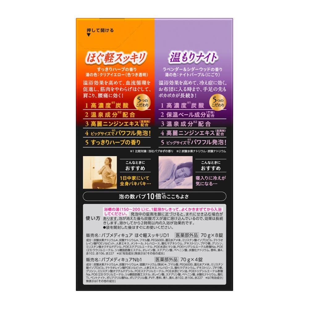 立ち仕事や運動による足腰などのつらい疲労に、ほぐ軽スッキリ!寝入りの時に気になるつらい冷えに、温もりナイト! 忙しい現代人の特に疲れがたまった時に選べる2種類。 いつものオフロが高濃度※1炭酸のオフロに変わる!。 温浴効果を高めて、疲労・肩こり・腰痛・冷え症に効く。 ※1比較対象:バブゆずの香り ほぐ軽スッキリ ●すっきりハーブの香り。温もりナイト ●ラベンダー&シダーウッドの香り ●にごりタイプ