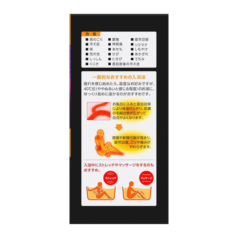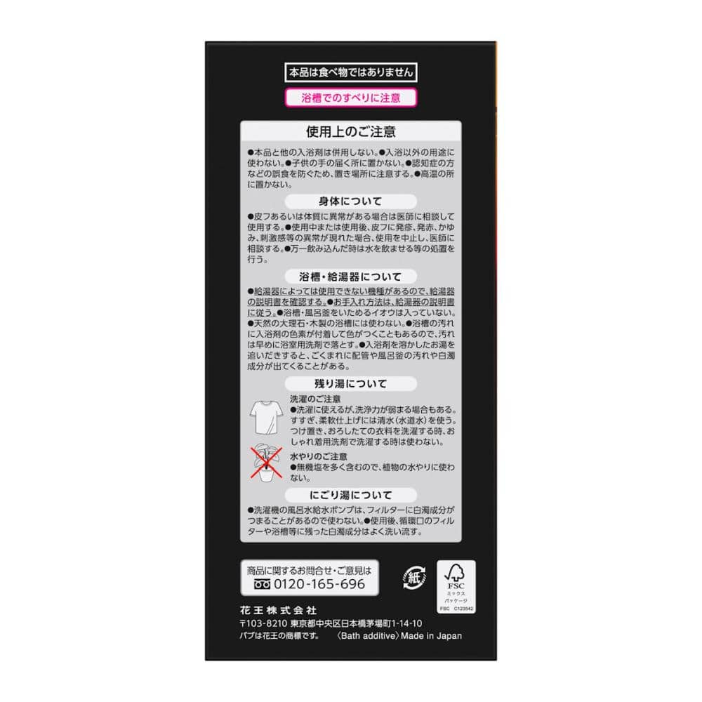 使用上の注意:●本品と他の入浴剤は併用しない。 ●入浴以外の用途に使わない。 ●子供の手の届く所に置かない。 ●認知症の方などの誤食を防ぐため、置き場所に注意する。 ●高温の所に置かない。 身体について ●皮フあるいは体質に異常がある場合は医師に相談して使用する。 ●使用中または使用後、皮フに発疹、発赤、かゆみ、刺激感等の異常が現れた場合、使用を中止し、医師に相談する。 ●万一飲み込んだ時は水を飲ませる等の処置を行う。 浴槽・給湯器について ●給湯器によっては使用できない機種があるので、給湯器の説明書を確認する。 ●お手入れ方法は、給湯器の説明書に従う。 ●浴槽・風呂釜をいためるイオウは入っていない。 ●天然の大理石・木製の浴槽には使わない。 ●浴槽の汚れに入浴剤の色素が付着して色がつくこともあるので、汚れは早めに浴室用洗剤で落とす。 ●入浴剤を溶かしたお湯を追いだきすると、ごくまれに配管や風呂釡の汚れや白濁成分が出てくることがある。 残り湯について 洗濯のご注意 ●洗濯に使えるが、洗浄力が弱まる場合もある。すすぎ、柔軟仕上げには清水(水道水)を使う。つけ置き、おろしたての衣料を洗濯する時、おしゃれ着用洗剤で洗濯する時は使わない。