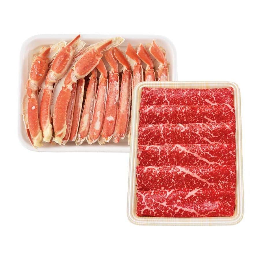 殻上側半分だけ取り除き食べやすくした年末に最適なボイルずわい蟹と北海道産黒毛和牛のすき焼き用をセット。