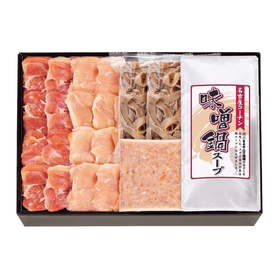 【セット内容】名古屋コーチンもも肉、むね肉220g、名古屋コーチンつみれ150g、全粒粉入りうどん220g×2、味噌鍋スープ600g
