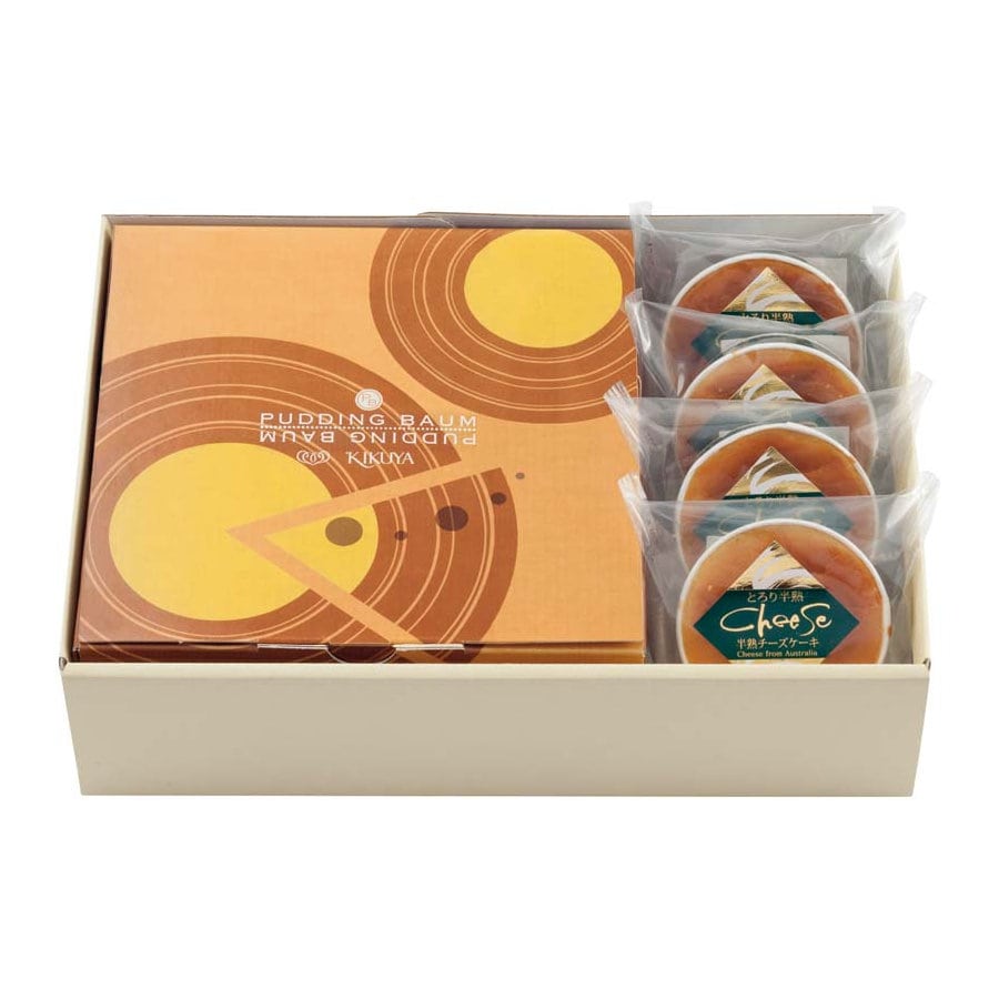 バームクーヘンの輪の中にプリンを入れたぷりんバームと柔らか食感の半熟チーズケーキの詰合せ