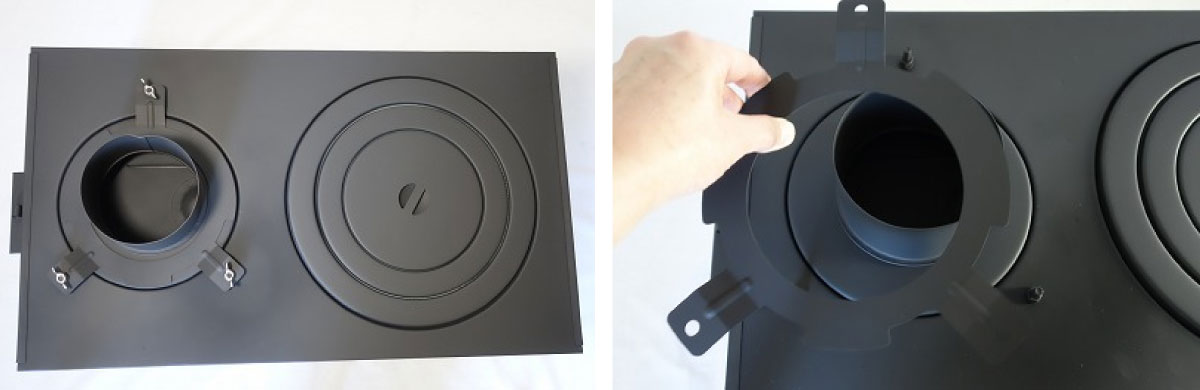 煙突の差込口は、押さえリングをネジに通し、のせて蝶ネジで留めます。(トトノエーラはリングがシルバーに塗装してあります。)