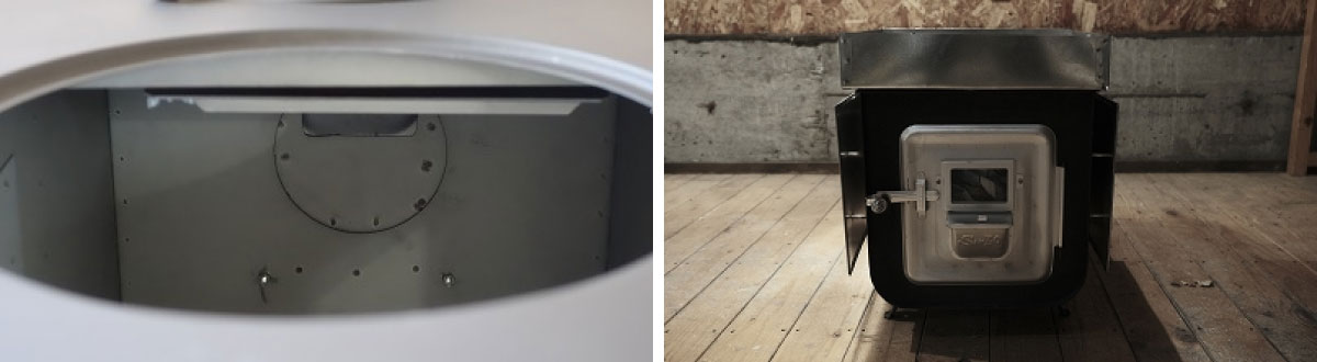 ストーブの中は扉側が燃焼室になっています。奥上には火止めがついていて、火が直接煙突にいかない二重構造になっています。