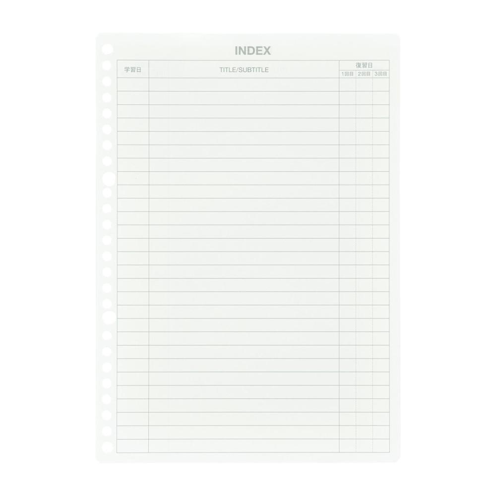 迷わず記入できる5つの機能スペース設計。学習項目が把握できるインデックスページ付き。