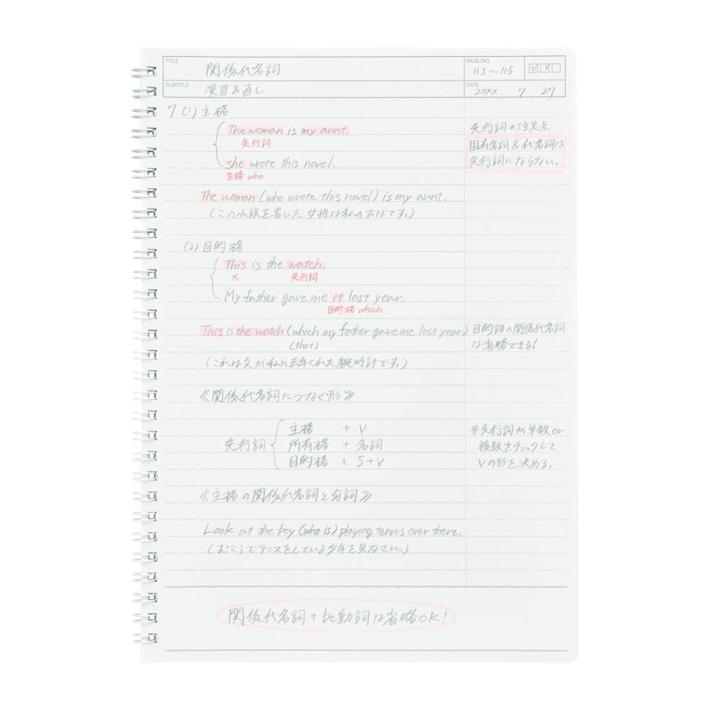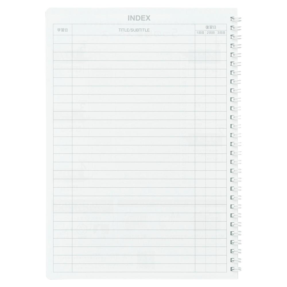 迷わず記入できる5つの機能スペース設計。リングノートなので、狭い机でも省スペースに使える。学習項目が把握できるインデックスページ付きカバンの中で痛まない角丸加工。