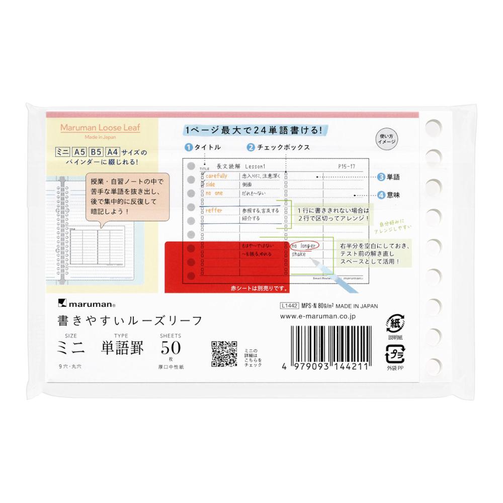 1枚で最大48単語、たくさんの単語が記入できる。要点だけを絞って書けるシンプルな罫設計。