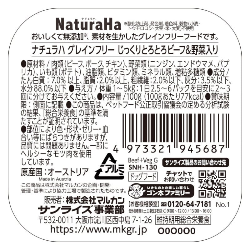 原材料・成分:肉類(ビーフ、ポーク、チキン)、野菜類(ニンジン、エンドウマメ、パプリカ)、いも類(ポテト)、油脂類、ビタミン類、ミネラル類、増粘多糖類