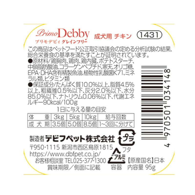 原材料・成分:鶏胸肉、鶏肉、鶏内臓、ポテトスターチ、中鎖脂肪酸油、コラーゲンペプチド、寒天、オリゴ糖、EPA・DHA含有精製魚油、植物性乳酸菌K71、ミネラル類、ビタミン類