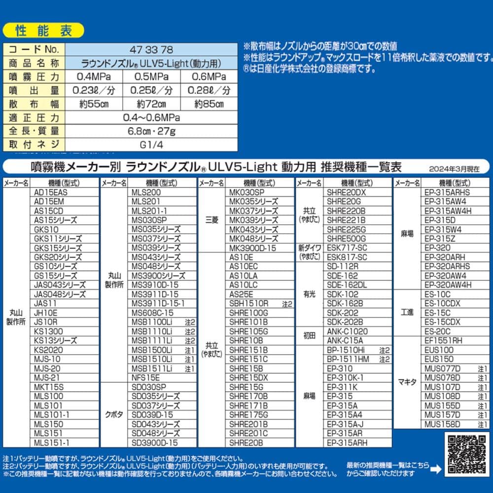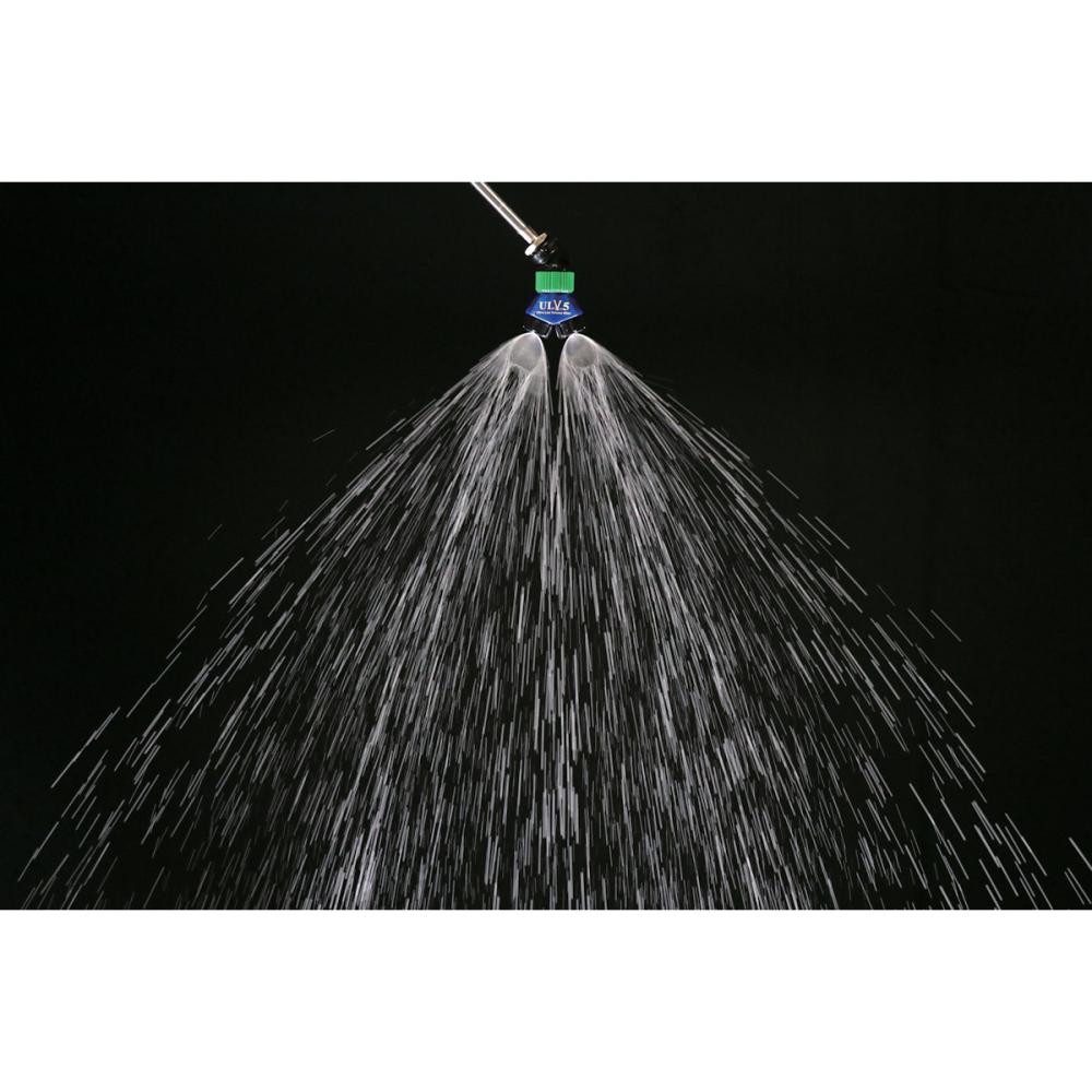 ●除草剤ラウンドアップマックスロード専用設計のラウンドノズルULV5は、新しく開発せされたULV5テクノロジー[ツインノズル]の最適な粒子径分布パターンと均一なスプレーパターンにより、水5L/10aの少水量散布を実現しました。 ●ツインノズルで空気を混入した噴霧液はドリフトが少なくなります。 ●今までと同じ水量を給水する場合には、一度の給水でより広い面積に散布でき、除草作業の大幅な省力化が可能です。