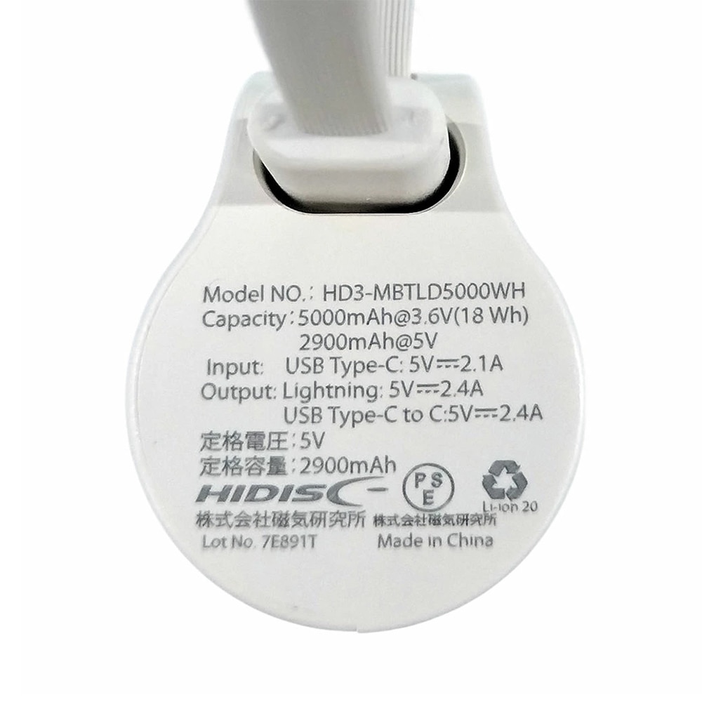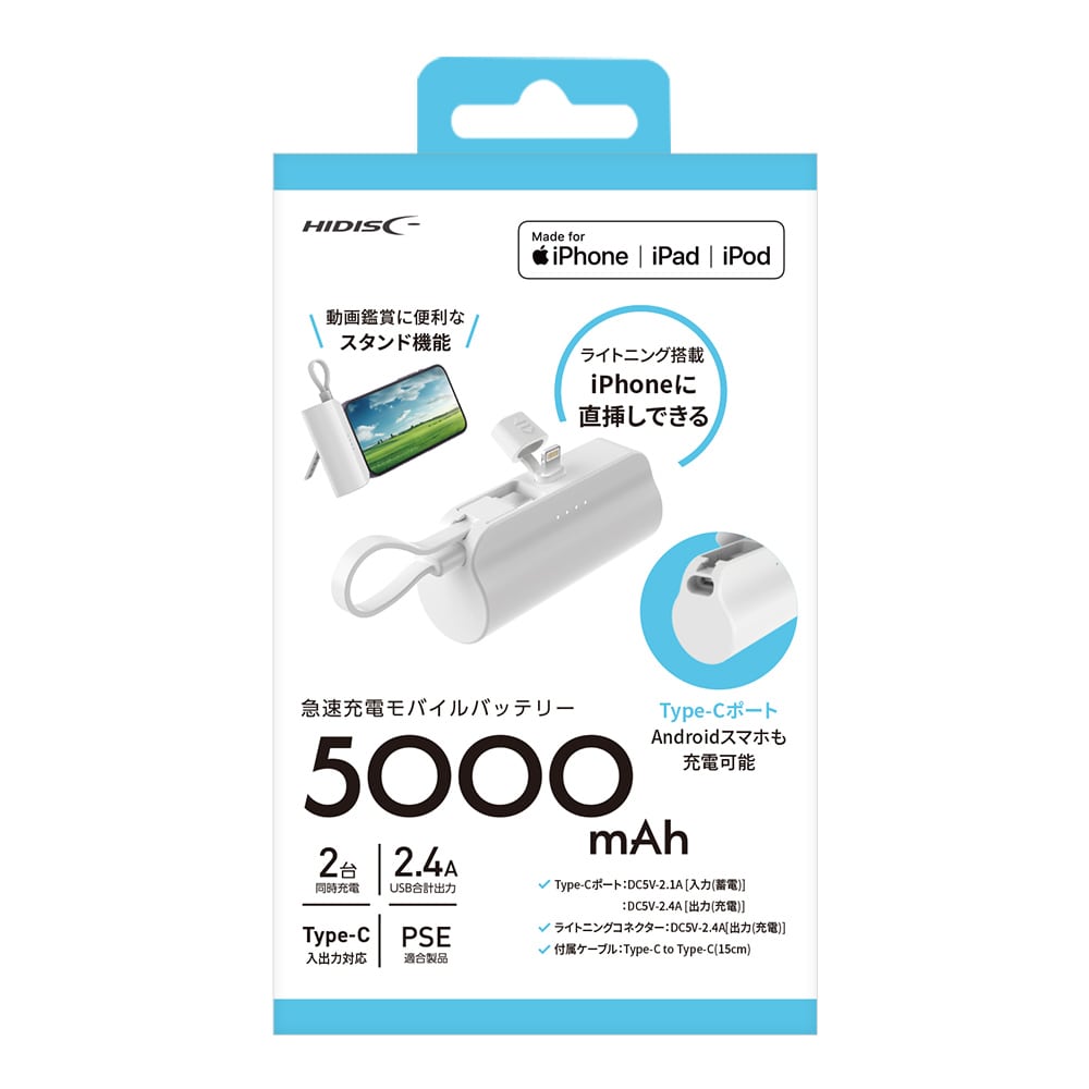 バッテリー残量表示 保護回路(ショート、過充電、過放電、過電流、加熱防止) PSE適合製品 付属品:USB TYPE C to USB TYPE Cケーブル 1本(約15cm) バッテリー容量:5000mAh 入力:Type-C:DC5V/2.1A 出力:Type-C:DC5V/2.4A ライトニングコネクター:DC5V/2.4A ※最大出力合計:DC5V-2.4A 充電時間:約3時間 充電回数:500回