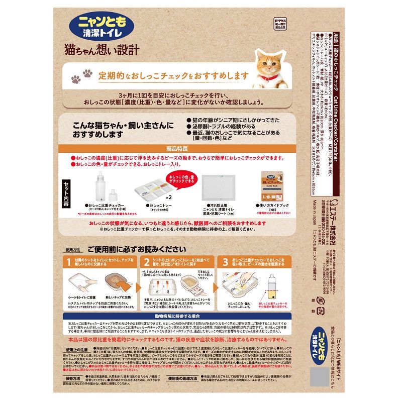 お取り扱い上の注意:本品は猫の尿比重を簡易的にチェックするものです。猫の疾患や症状を診断、治療するものではありません。 ●用途以外には使用しないでください。 ●おしっこ比重チェッカーは1回使い切りです。1度使用したおしっこ比重チェッカーを再使用しないでください。 ●おしっこの濃さ(比重)は、猫ちゃんの食餌、時間帯、使用時の環境などで変化する場合があります。 ●ビーズの動きが安定するのに時間がかかることがあります。おしっこを採ってキャップをした後、おしっこ比重チェッカーの上下を何度か反転し、ビーズとおしっこをなじませてからビーズの動きをご確認ください。 ●おしっこの色や濃さ(比重)の変化を知ることは、猫ちゃんの状態を知ることにもつながりますが、すべての猫ちゃんに当てはまるわけではありません。 ●おしっこチェックの結果に関わらず、何らかの症状がある場合は獣医師にご相談ください。 ●おしっこが入ったおしっこ比重チェッカーを持ち運ぶ場合は、キャップをしっかり閉めてください。おしっこがもれる恐れがあります。 ●おしっこ比重チェッカーの中のビーズは取り出さないでください。 ●本品は食べ物ではありません。お子さまや認知症の方などの誤食にご注意ください。 ●万一、飲み込んだり、食べてしまった場合は、医師や獣医師にご相談ください。 ●本品は水に溶けないので水洗トイレに流さないでください。