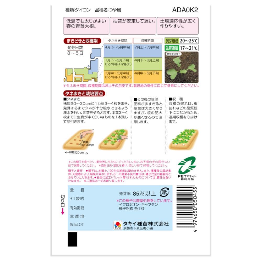 ●掲載のパッケージ画像(表側・裏側)に記載されている蒔き時期、収穫時期、発芽適温、発芽率、品種特長、その他注意事項をよくご確認の上、ご注文ください。