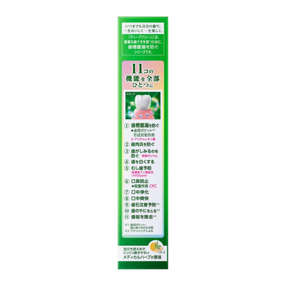 歯槽膿漏を防ぐとともに、11コの機能を全部ひとつにしたプレミアム処方の薬用ハミガキ。 選び抜かれた薬用成分(歯がしみるのを防ぐ・抗炎症・殺菌・歯質強化)配合。 抗炎症成分(Bーグリチルレチン酸)が、歯周ポケットの中までしっかり届き、歯周ポケットが深くなるのを抑制して、歯槽膿漏を防ぐ。 泡立ち控えめでじっくり磨きやすいメディカルハーブの香味。 高濃度フッ素(1450ppm)配合。 (医薬部外品)