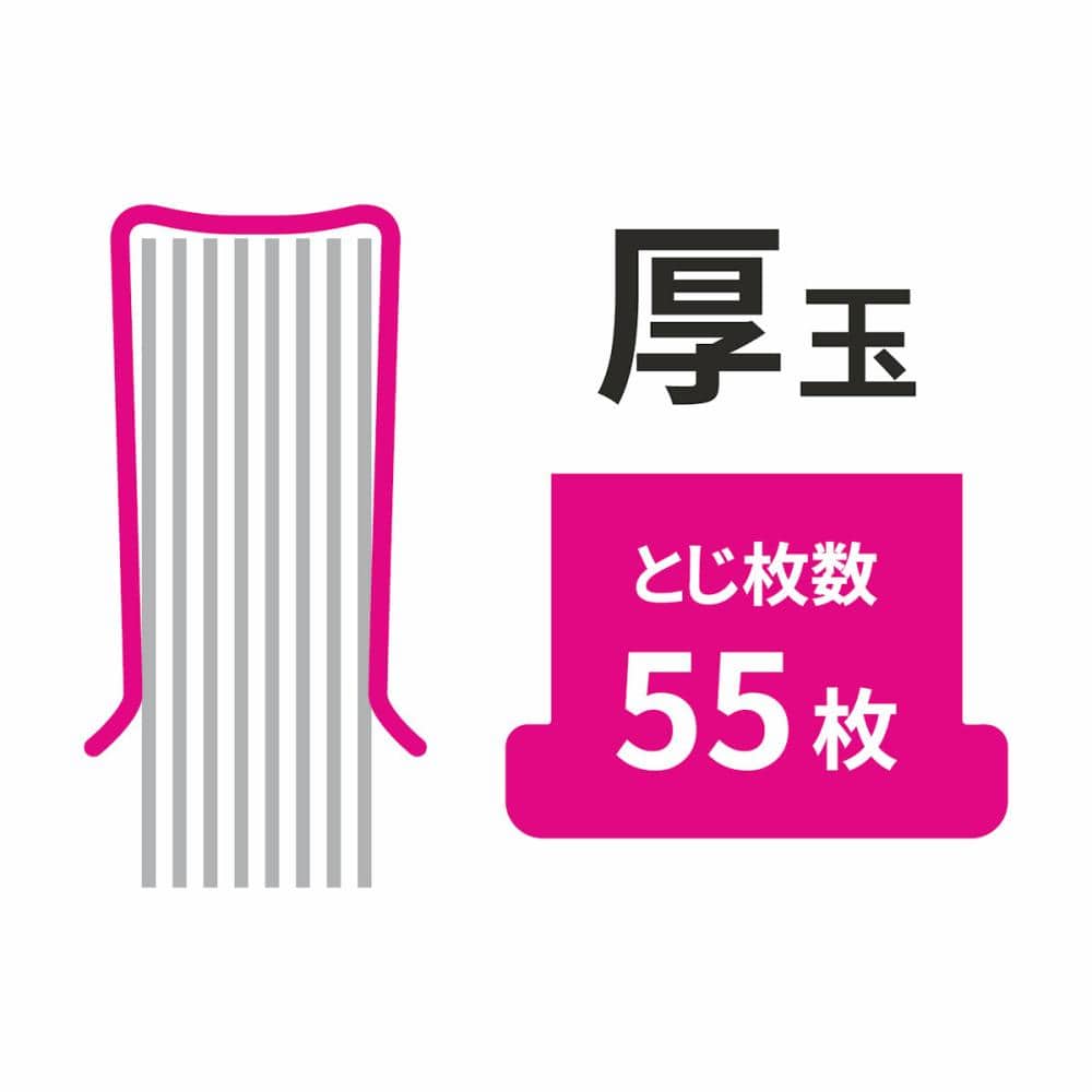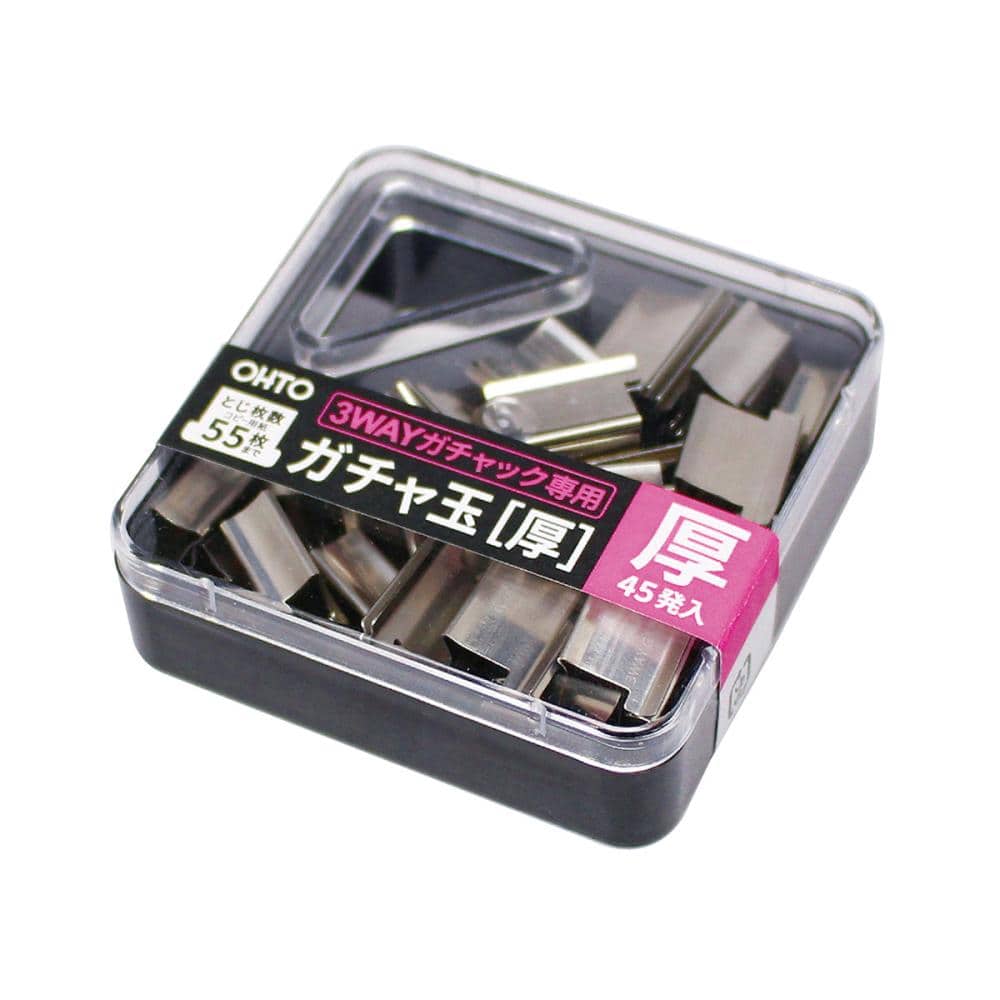 コピー用紙約55枚まで閉じられます。45発入。厚玉・薄玉は3WAYガチャック専用玉となります。