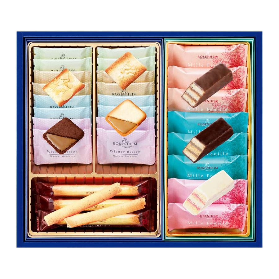 国産バターを使用した、繊細な食感のラング、ド、シャクッキー「ヴィーナービッセン」と、 サクサクのパイをチョコレートで包んだ「ミルフィーユ」を詰め合わせました。ローゼンハイムのスペシャリテが詰まった、 秋冬限定の自慢の一品です。