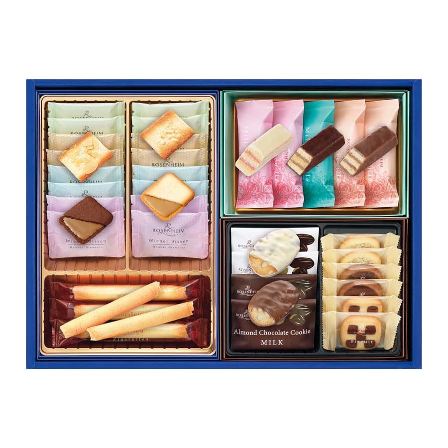【セット内容】ミルフィーユ(ジャンドゥーヤ×2、ベリー×2、コーヒー)、ヴィーナービッセン(マカダミアナッツ、アーモンド、ヘーゼルジャンドゥーヤ、アーモンドジャンドゥーヤ)×各4、ツィガレッテン×4、アーモンドチョコレートクッキー(ミルク、ホワイト)×各2、ビスケット(チョコ&バター、チョコチップ、紅茶)×各2