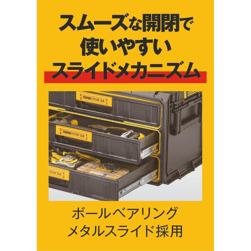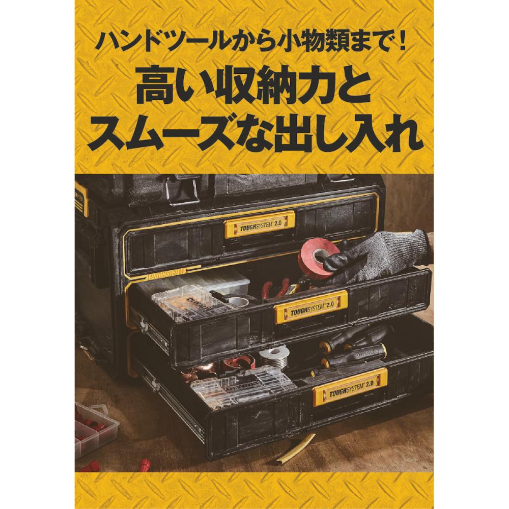 "●強化された4mm厚のポリプロピレン樹脂製 ●ツール、アクセサリー、消耗品の収納に便利な3つの引き出し ●引き出しラッチロックあり ●すべてのTough System ラッキング、キャリアに連結可能 ●工具やアタッチメントを収納できる豊富な収納スペース ●総荷重22Kg ●ボールベアリングの金属製スライドで引き出しの開閉もスムーズです。 ●ハーフサイズ用アダプター付き ●ワイドキャリーハンドル付 **デウォルトTOUGH SYSTEM(タフシステム)同士での連結が可能。 ※別売りのアダプター(DWST0"