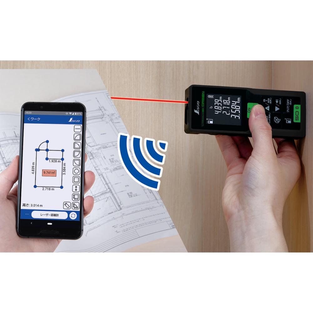 "●視認性の高いグリーンレーザーです。 ●Bluetooth通信機能付で、測定値をスマートフォンやタブレット、パソコンに送信できます。 ●本体内蔵Bluetoothで、専用の受信機や送信機は不要です。 ●明るい場所でも読み取りやすい、黒地に白文字の液晶を採用しました。 ●ボタンを押した時に生じる手ブレを時間差測定で防ぎます。"