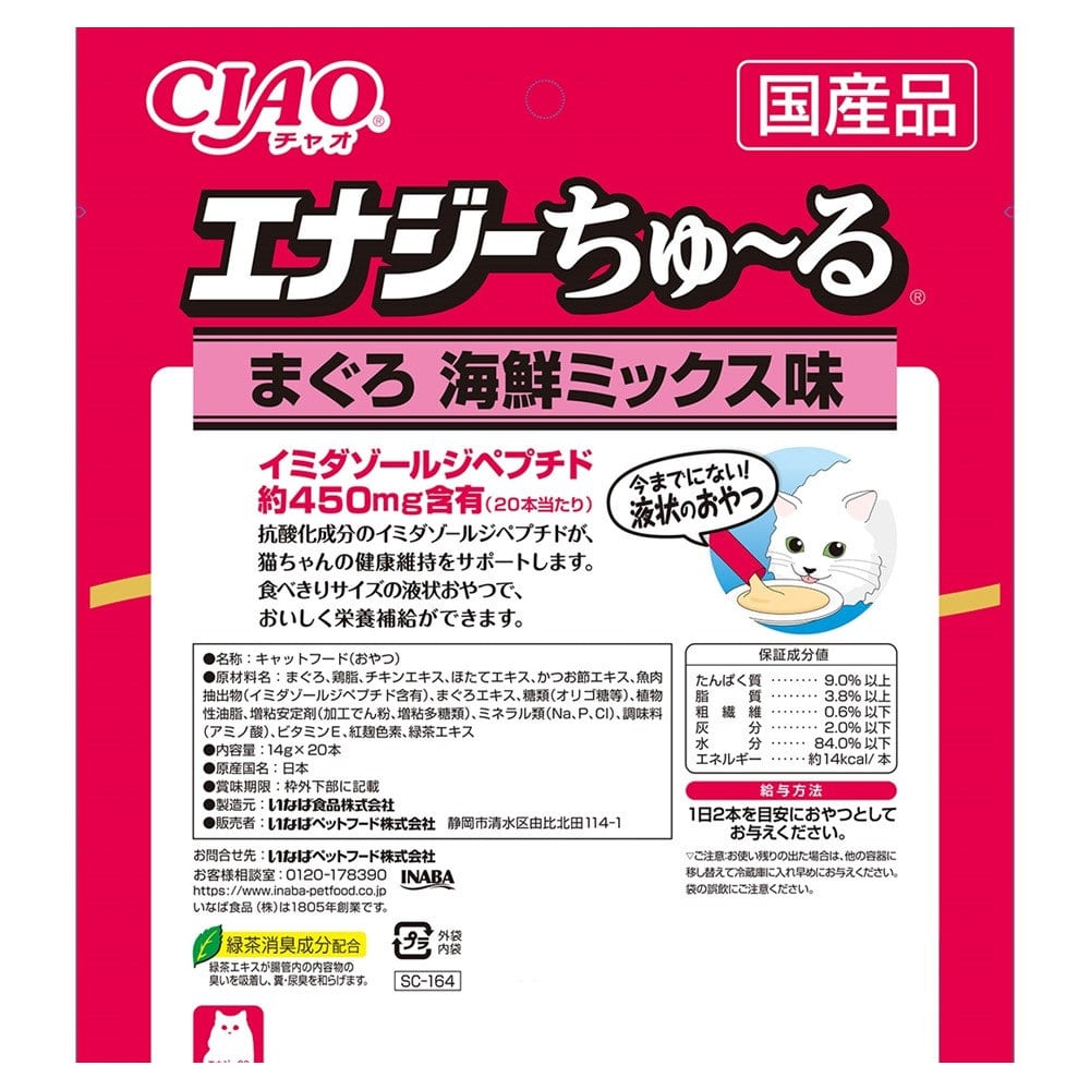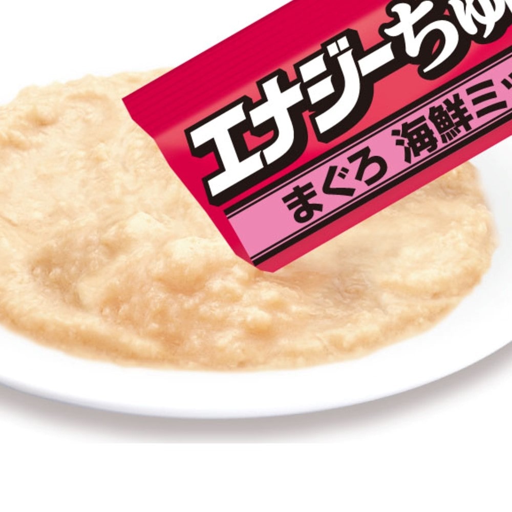 原材料・成分:まぐろ、鶏脂、チキンエキス、ほたてエキス、かつお節エキス、魚肉抽出物、まぐろエキス、糖類(オリゴ糖等)、植物性油脂、増粘剤(加工でん粉)、ミネラル類、増粘多糖類、調味料(アミノ酸等)、ビタミンE、紅麹色素、緑茶エキス