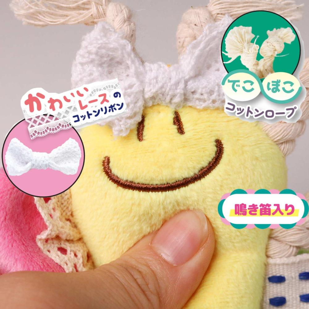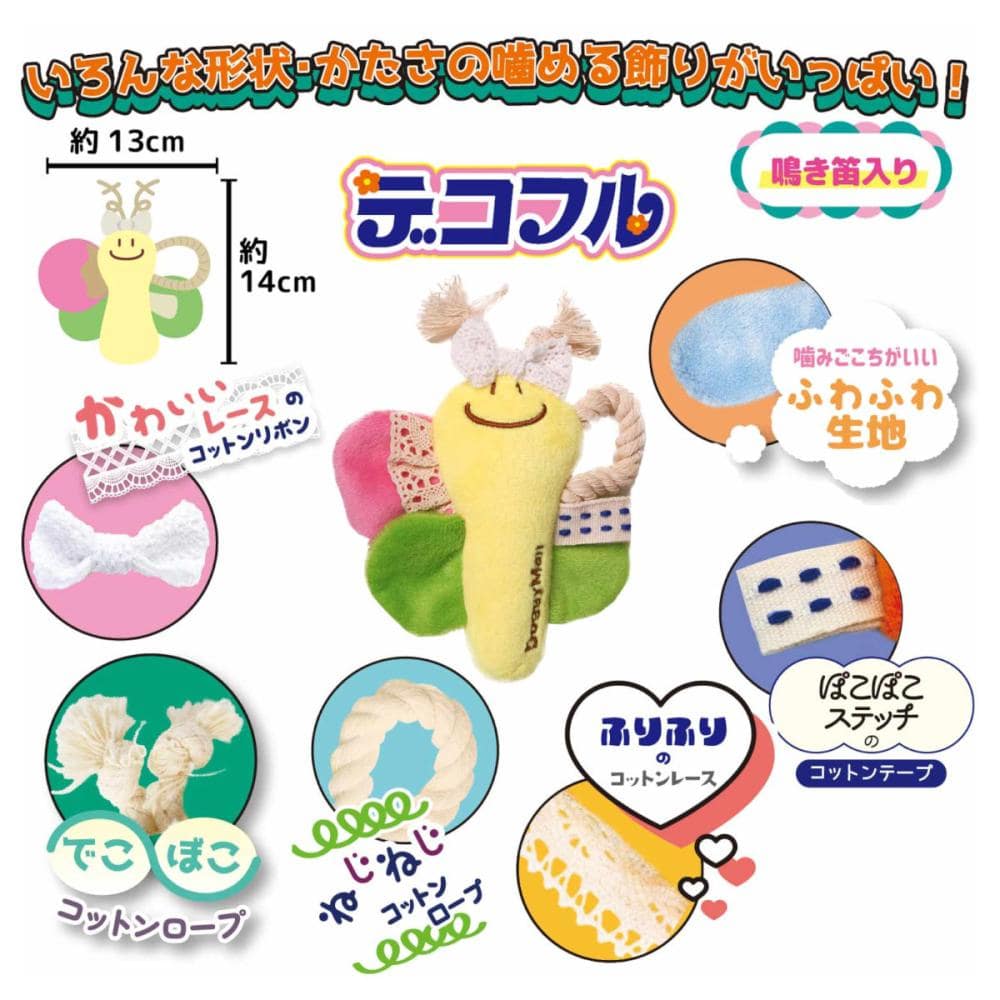 ●デコは全部で5パターン。かわいいレースのコットンリボン、歯がしっかり刺さるやわらかめのねじねじコットンロープ、結び目でこぼこコットンロープ、ポコポコステッチのコットンテープ、噛みやすいふりふりのコットンレース。