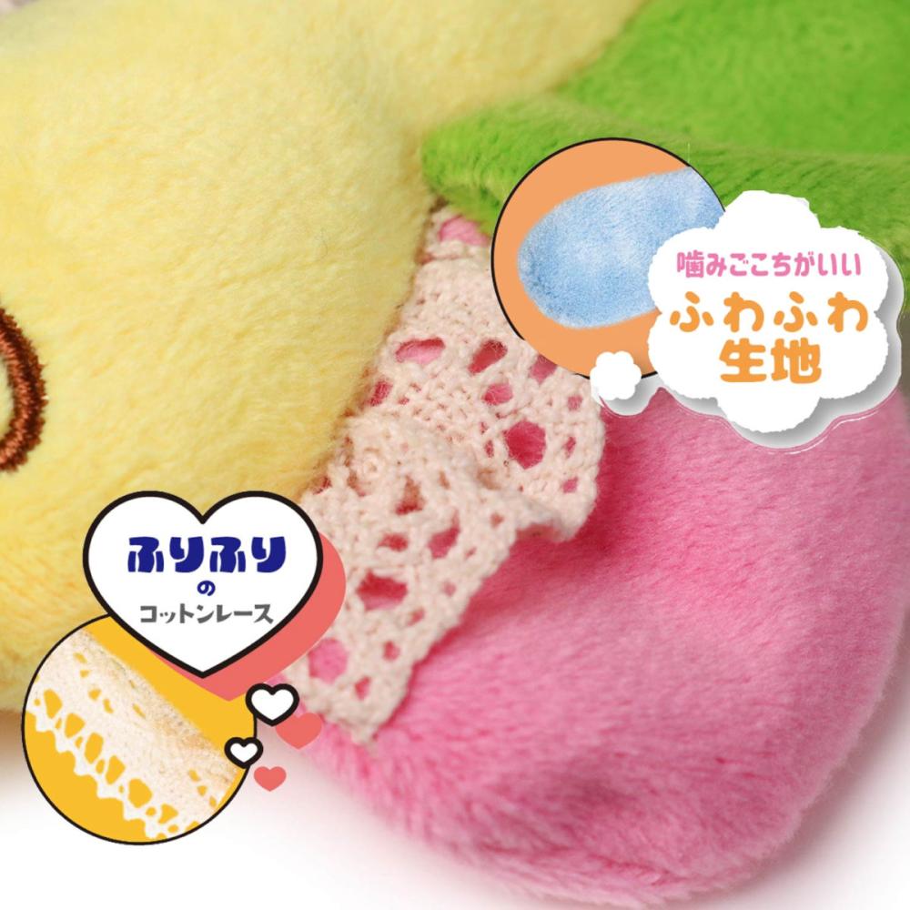 ●噛み心地の異なる素材をたくさんつけてあり色々かじれる。デコられたパーツを前歯でガシガシもたのしい。