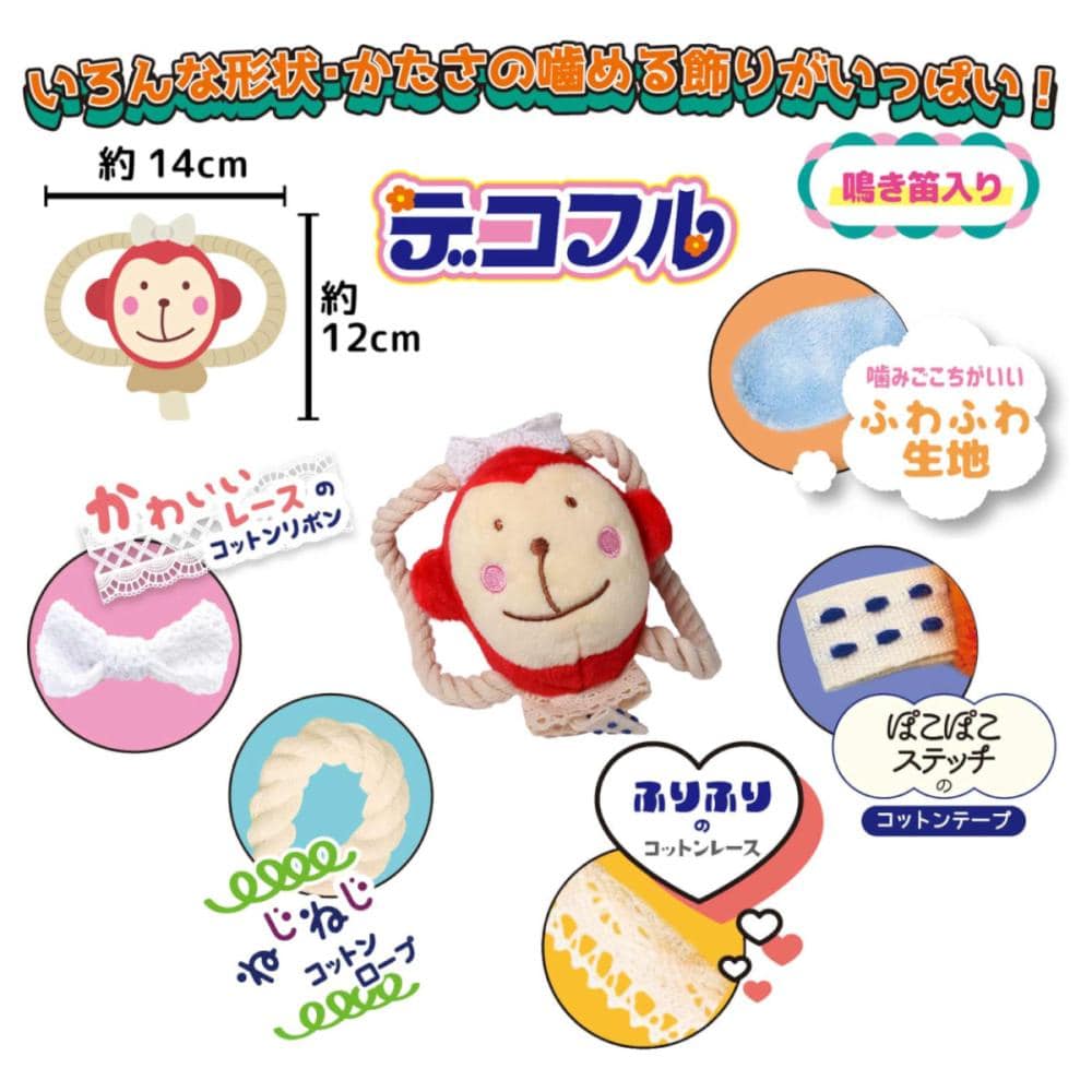 ●デコは全部で4パターン。かわいいレースのコットンリボン、歯がしっかり刺さるやわらかめのねじねじコットンロープ、ポコポコステッチのコットンテープ、噛みやすいふりふりのコットンレース。