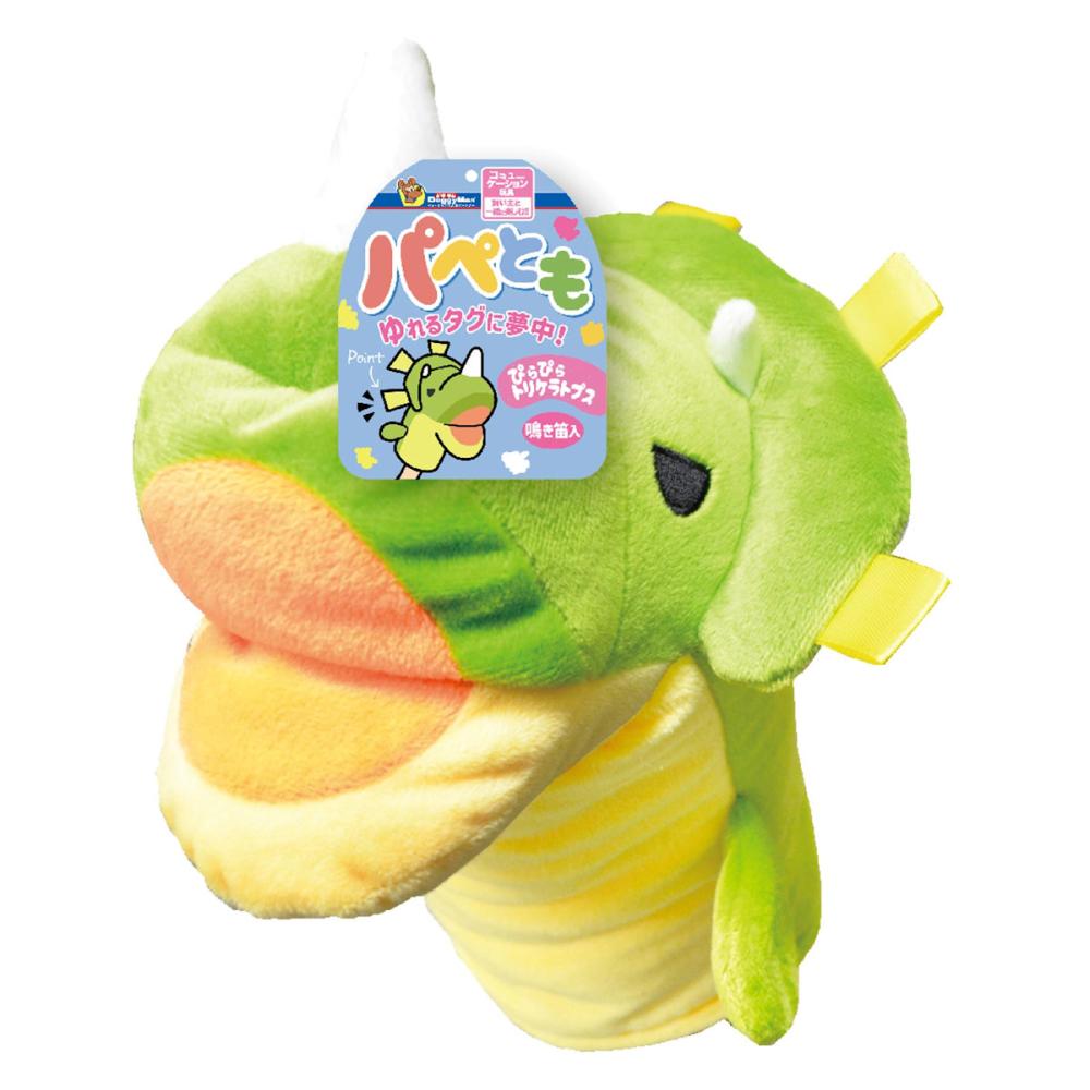 商品の利用(調理)方法:●本体からタグ、取説等を取り外し遊びます。●パペットの口をパクパクさせたり、笛を鳴らしたりして興味を持たせます。●興味を持ちはじめたら、一定の距離を保ちつつ、コミュニケーションをとりながら一緒に遊んであげましょう。