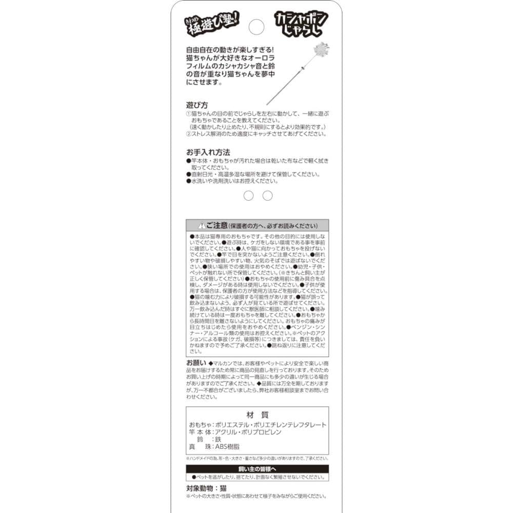 原材料・成分:おもちゃ:ポリエステル、ポリエチレンテレフタレート 竿本体:アクリル、ポリプロピレン 鈴:鉄 真珠:プラスチック